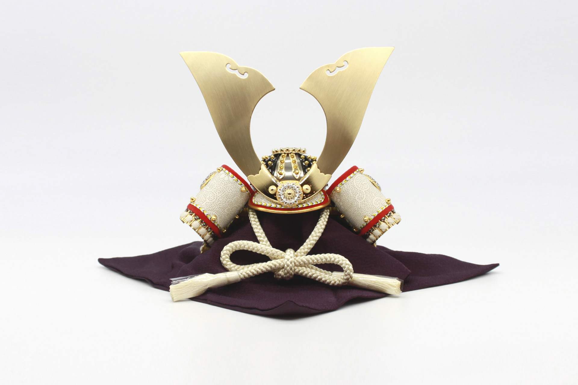 コンパクトな直径28cmの飾り台にシンプルに組み合わせた兜飾りです。小さいながらも極細の金小札に正絹の細白糸で威した錣(しころ)は繊細かつ上品な仕上がりになっております。吹き返しの部分は耐久性と耐水性に優れ、繊維が細いため柔らかくしなやかな「鹿革」を使用し、染色した後に漆で文様を描いた「印傳(印伝)」仕立てになっています。兜鉢は、「矧ぎ合せ鉢」になっており、ただプレスして楕円を作る安価なものではなく、板を一枚一枚矧ぎ合せて鋲でかしめ制作する技法を使用しています。