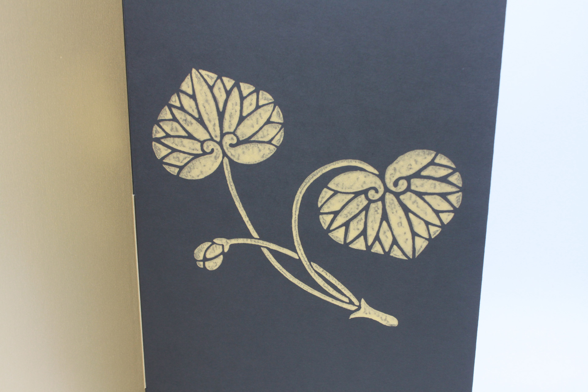 海外時代劇ドラマの劇中に登場した甲冑をお節句用にアレンジした作品。前立ての「葵の御紋」と京からかみ屏風「双葉葵」の「葵」繋がりで組み合わせています。モダンでシンプルな組み合わせの兜飾りになっています。