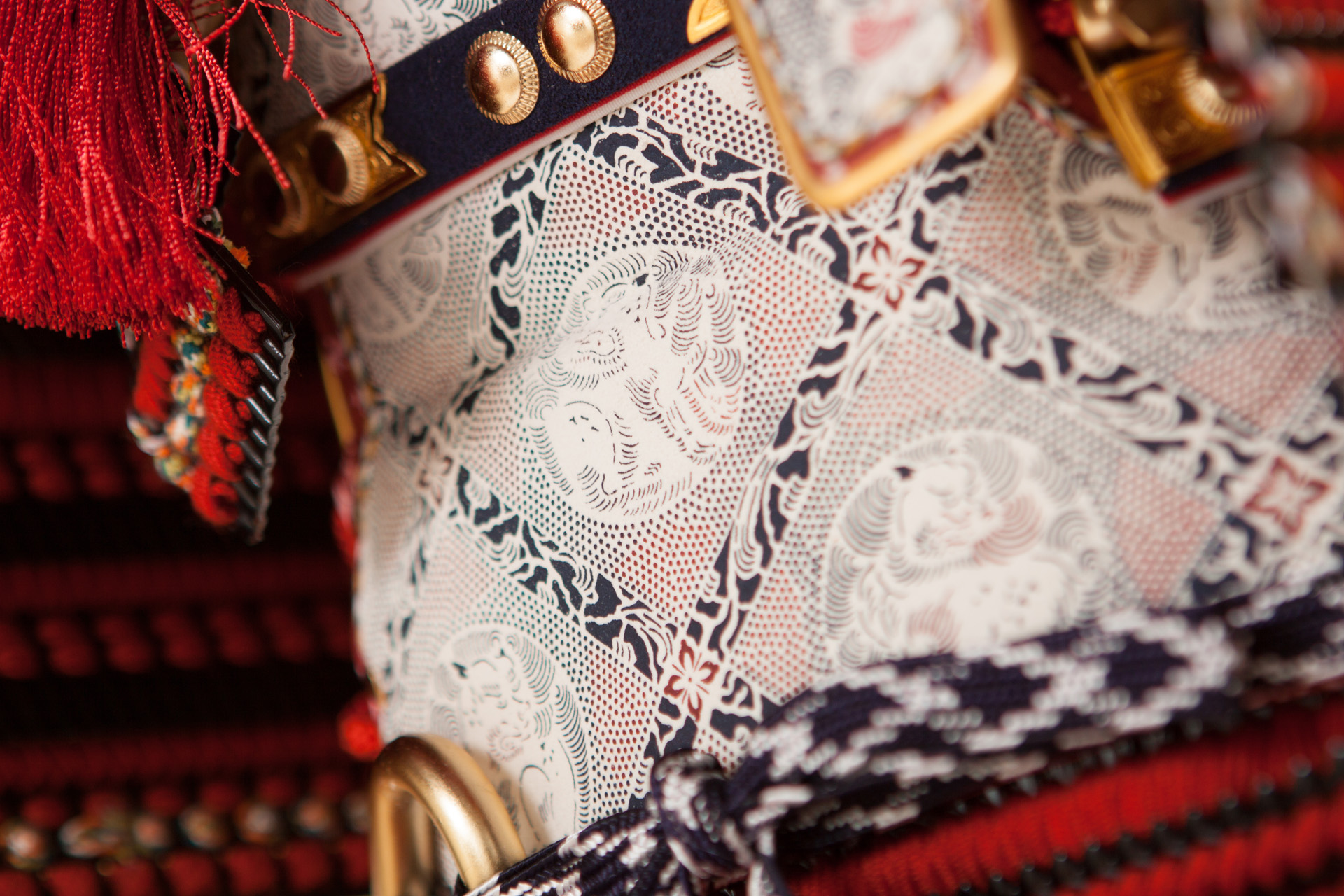 兜の吹き返しや胴などには本革を使用。小札は細かい3mmピッチとなっており、縅糸は色鮮やかな赤糸威しとなっております。