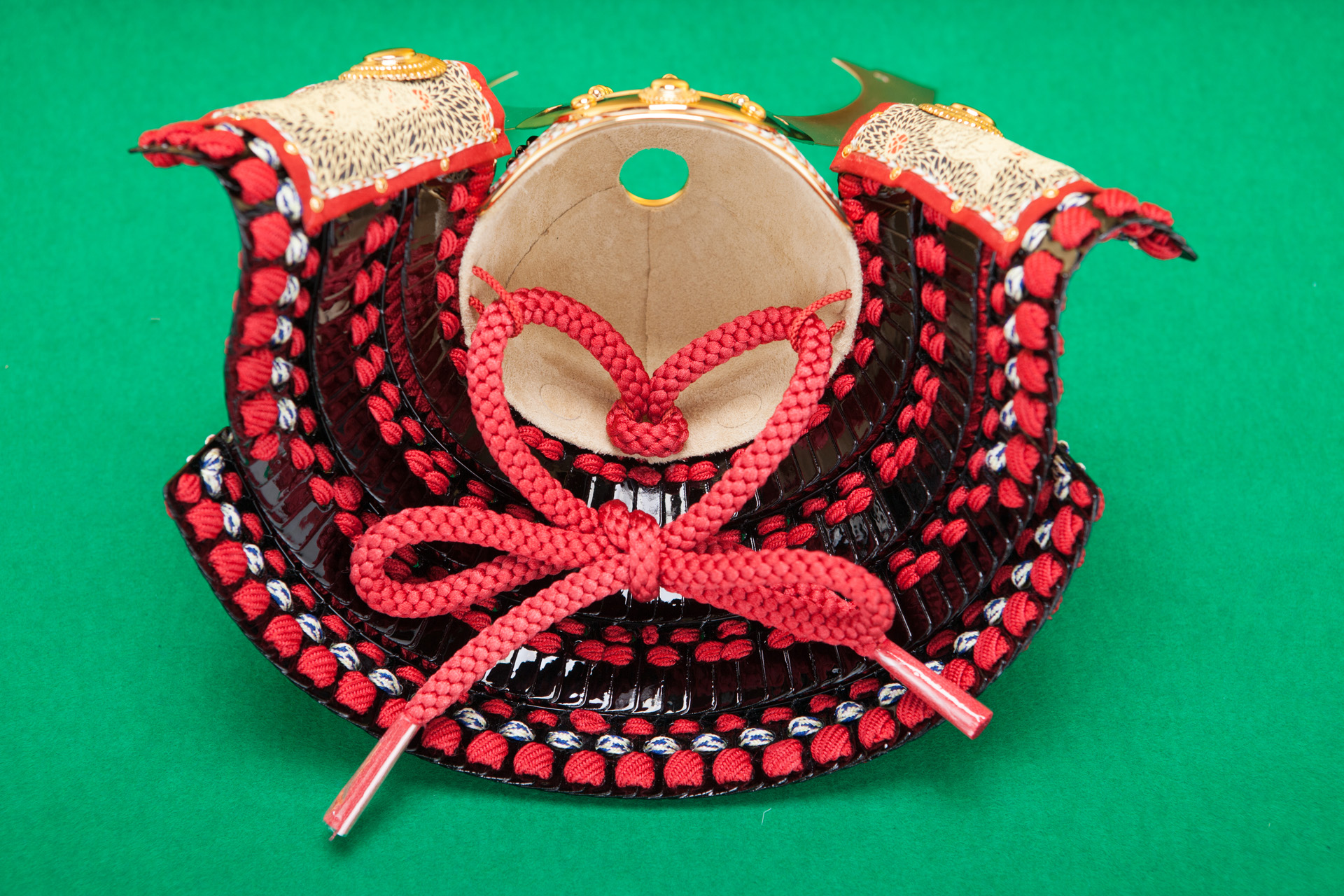 甲冑作りの真髄極めた名匠 加藤鞆美が三分の一サイズで制作した赤糸威之兜です。兜の小札は和紙小札と言う技法で出来ており、一枚一枚丁寧に和紙を組み合わせ漆を塗り固め、正絹の糸で威してあります。長い鍬形がとても印象的な兜です。