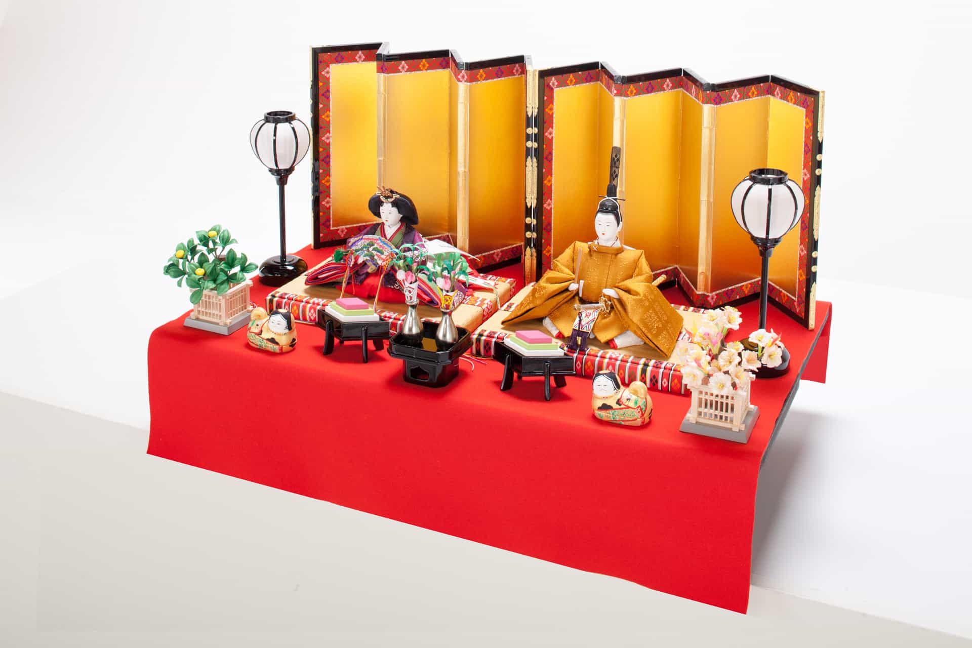 京都製の六曲一双屏風を使用した優美な雛飾りです。