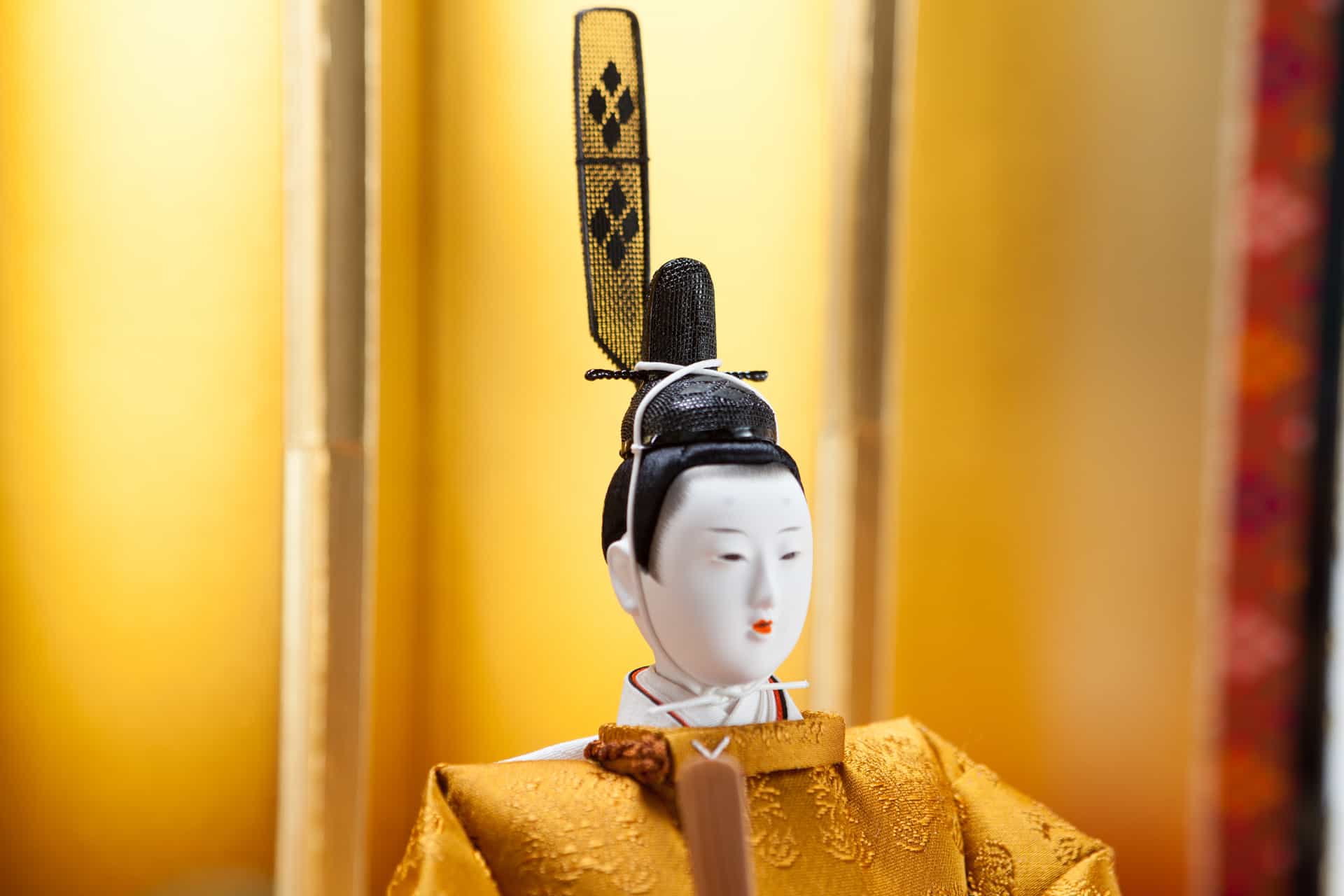 今日まで継承されている格調高い文様で、京都西陣織 正絹「黄櫨染 桐竹鳳凰麒麟文」。天皇陛下しか着ることが出来ない最高の御袍をお雛様で再現しております。