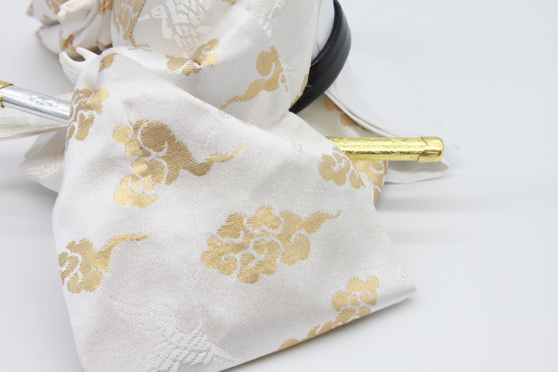 お殿様とお姫様は白糸と金糸を組み合わせて織り上げた「雲鶴文様」を使用。雲鶴文様は「瑞雲」と「鶴」を組み合わせた有職文様です。