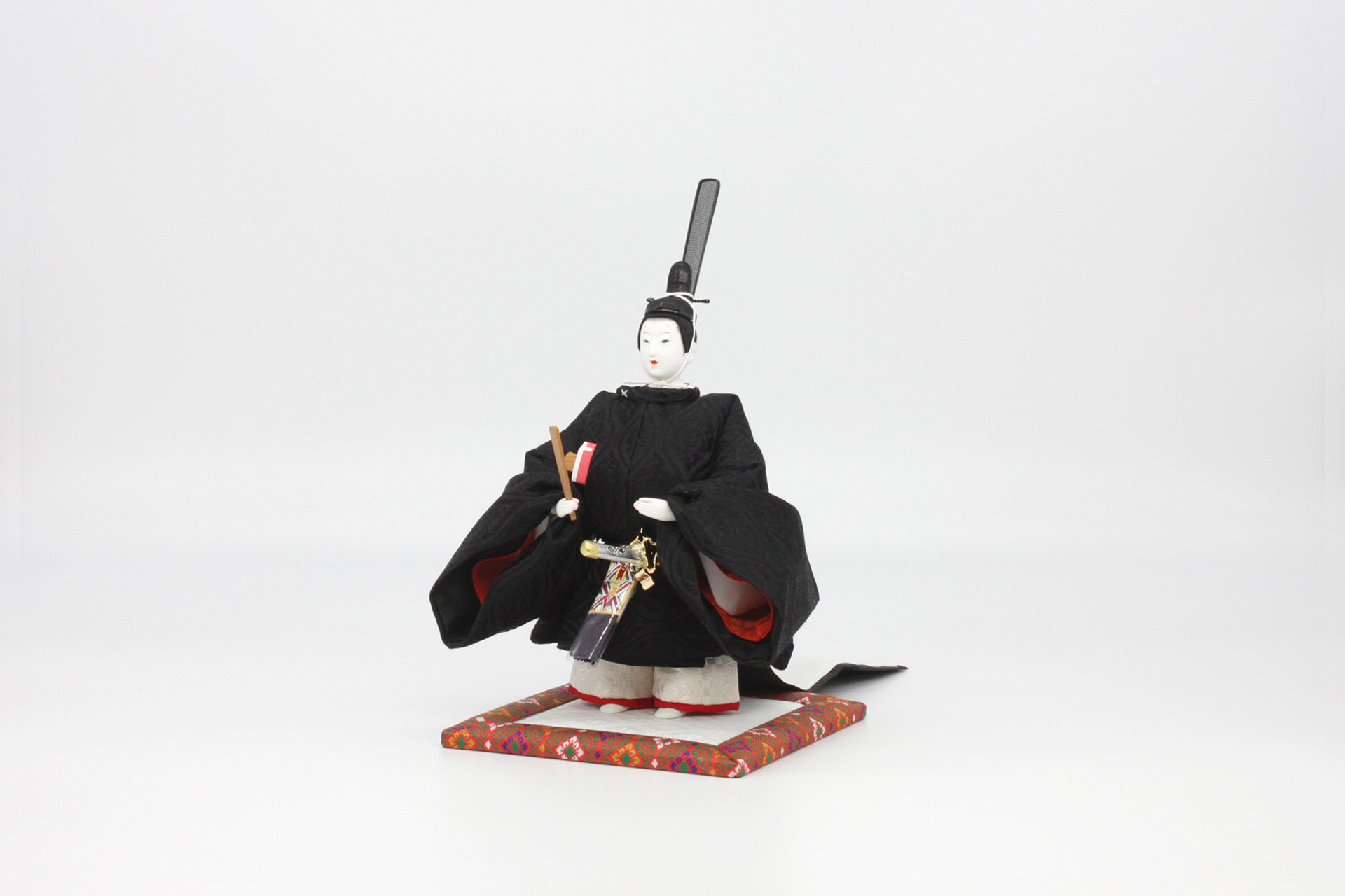 本作品を製作するにあたり高松宮妃のお雛様を研究し、同じ衣装柄を京都の機屋に別注で織っていた特殊な柄です。