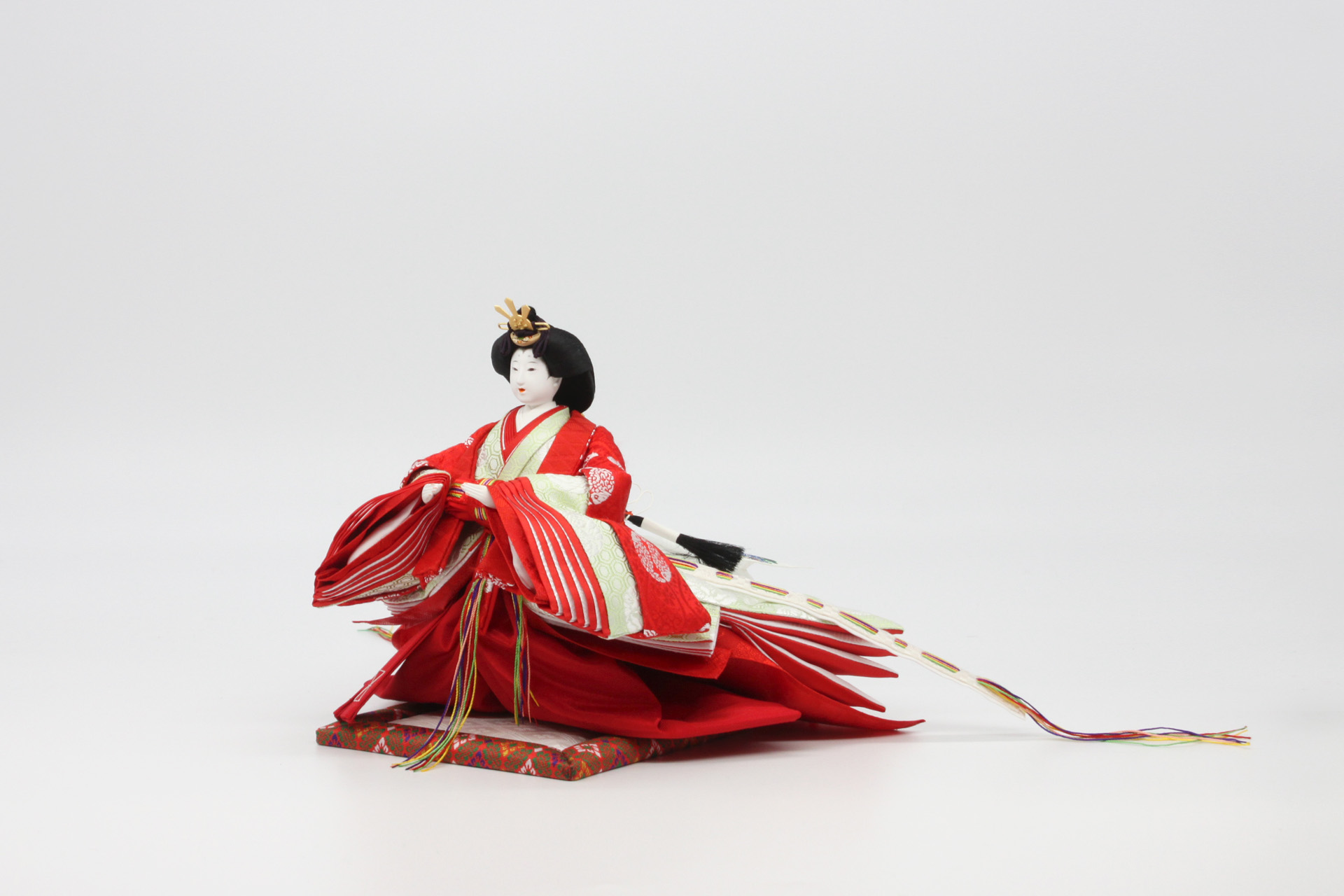本作品は静岡県所蔵「高松宮妃のお雛様」の衣装を模写し、立像とし製作した作品です。「高松宮妃のお雛様」とは今から90年以上前の昭和5年2月4日、第15代将軍徳川慶喜公の孫にあたられる高松宮妃喜久子さまがご成婚のお支度としてお持ちになったお雛様です。