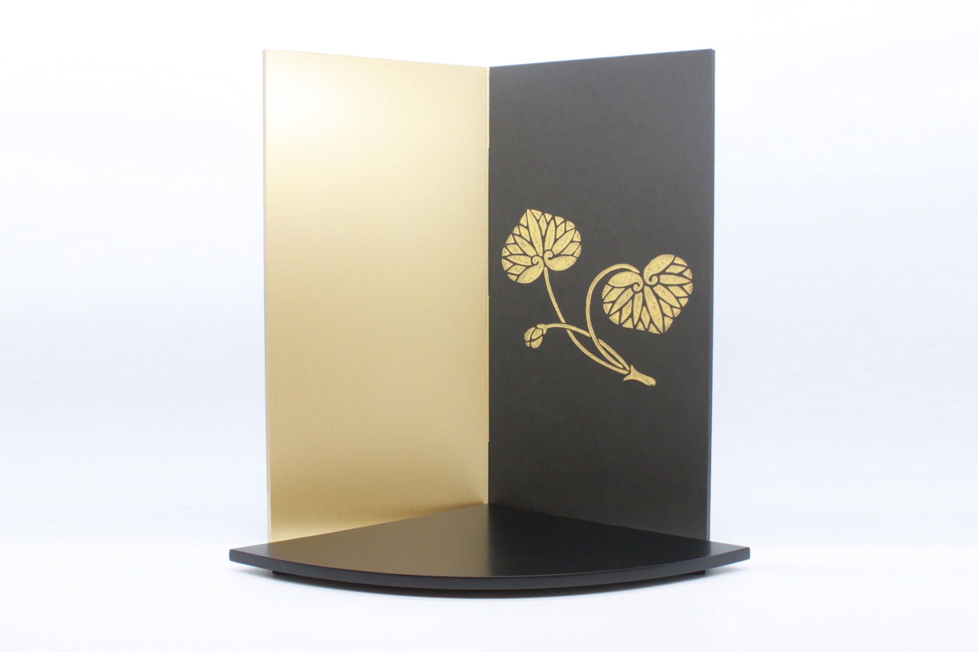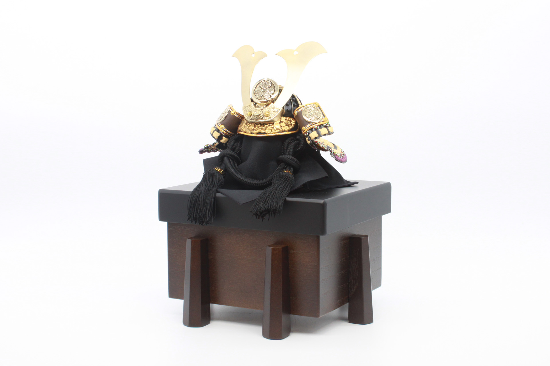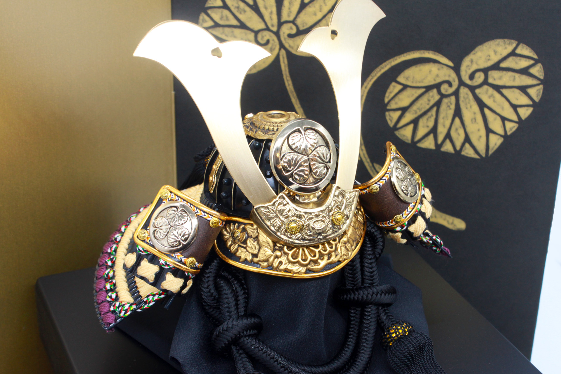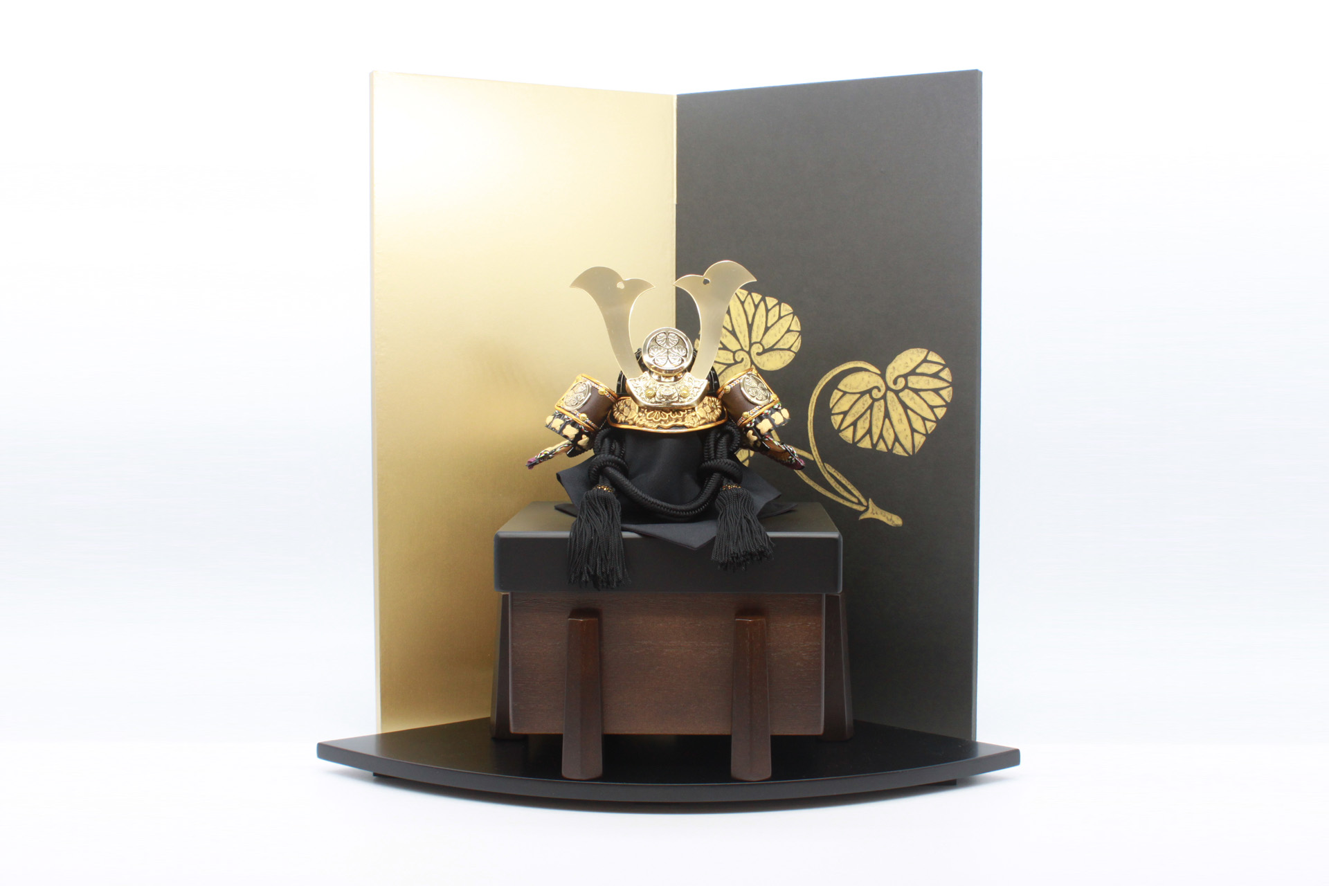 海外時代劇ドラマの劇中に登場した甲冑をお節句用にアレンジした作品。前立ての「葵の御紋」と京からかみ屏風「双葉葵」の「葵」繋がりで組み合わせています。モダンでシンプルな組み合わせの兜飾りになっています。