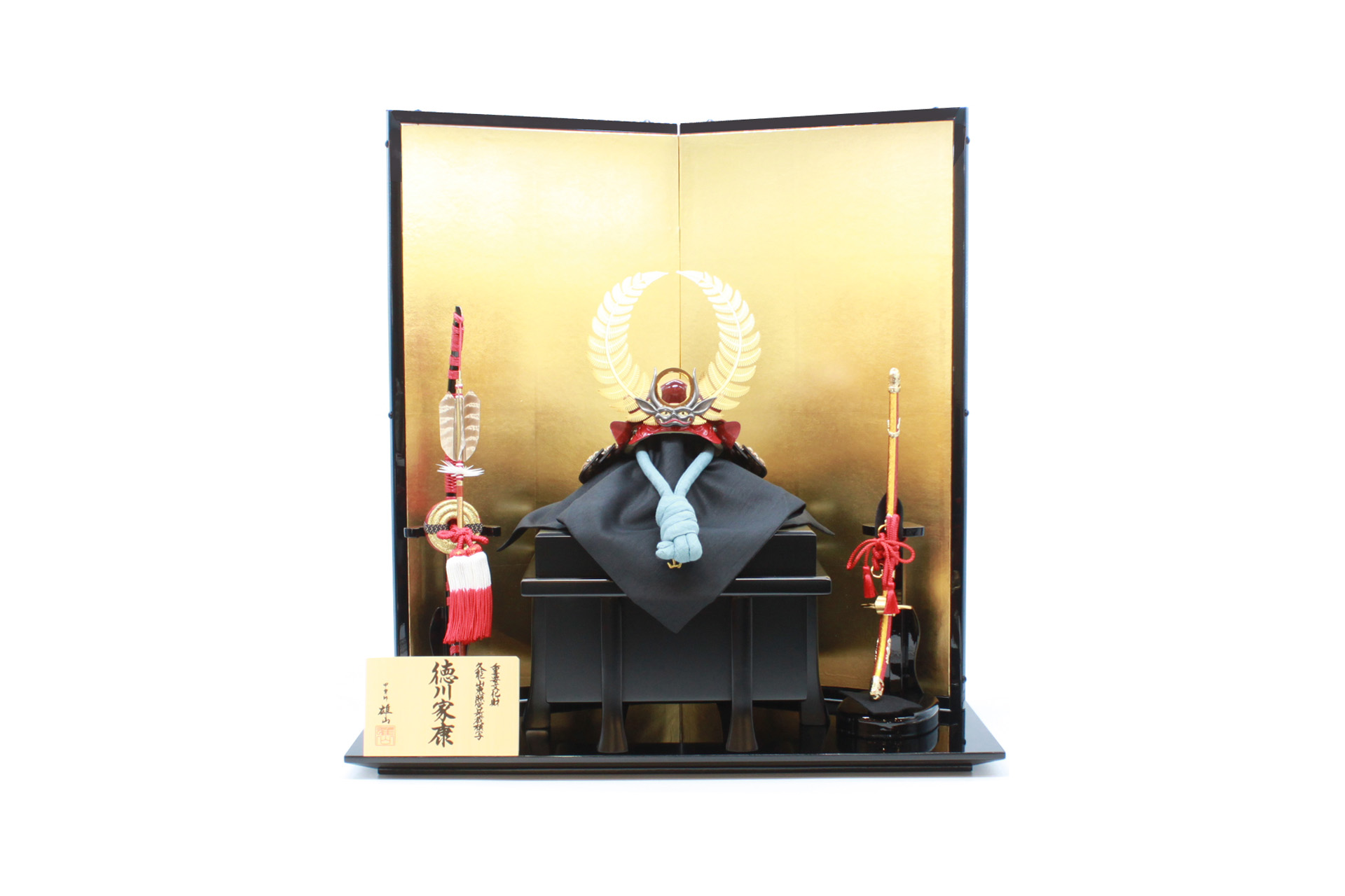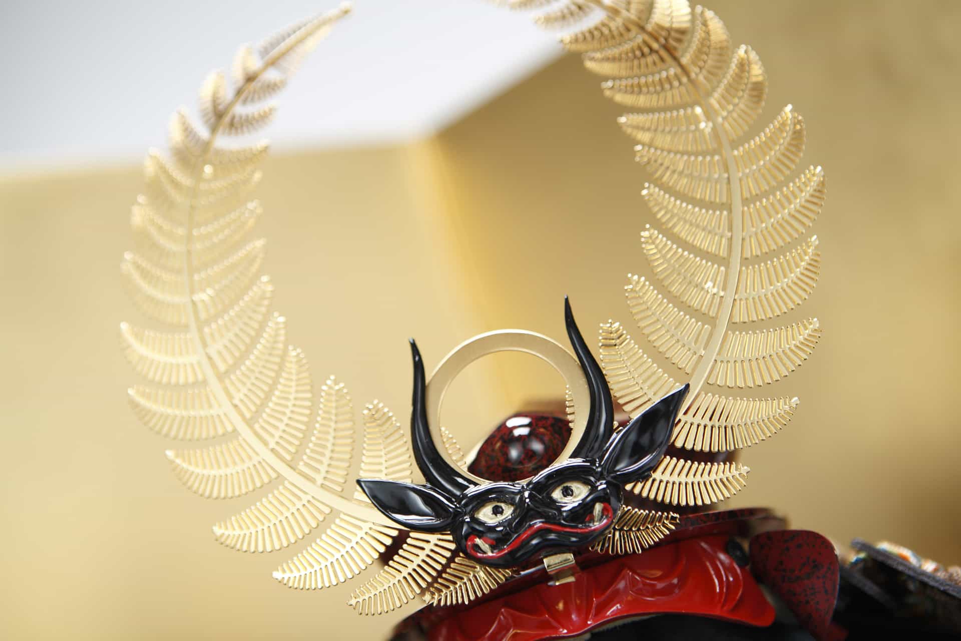 勝利を治める開運として知られる兜を、名匠雄山が制作しました。造形の見事さはもとより、細部まで丁寧に仕上げられております。端午の節句を豪華に演出します。
