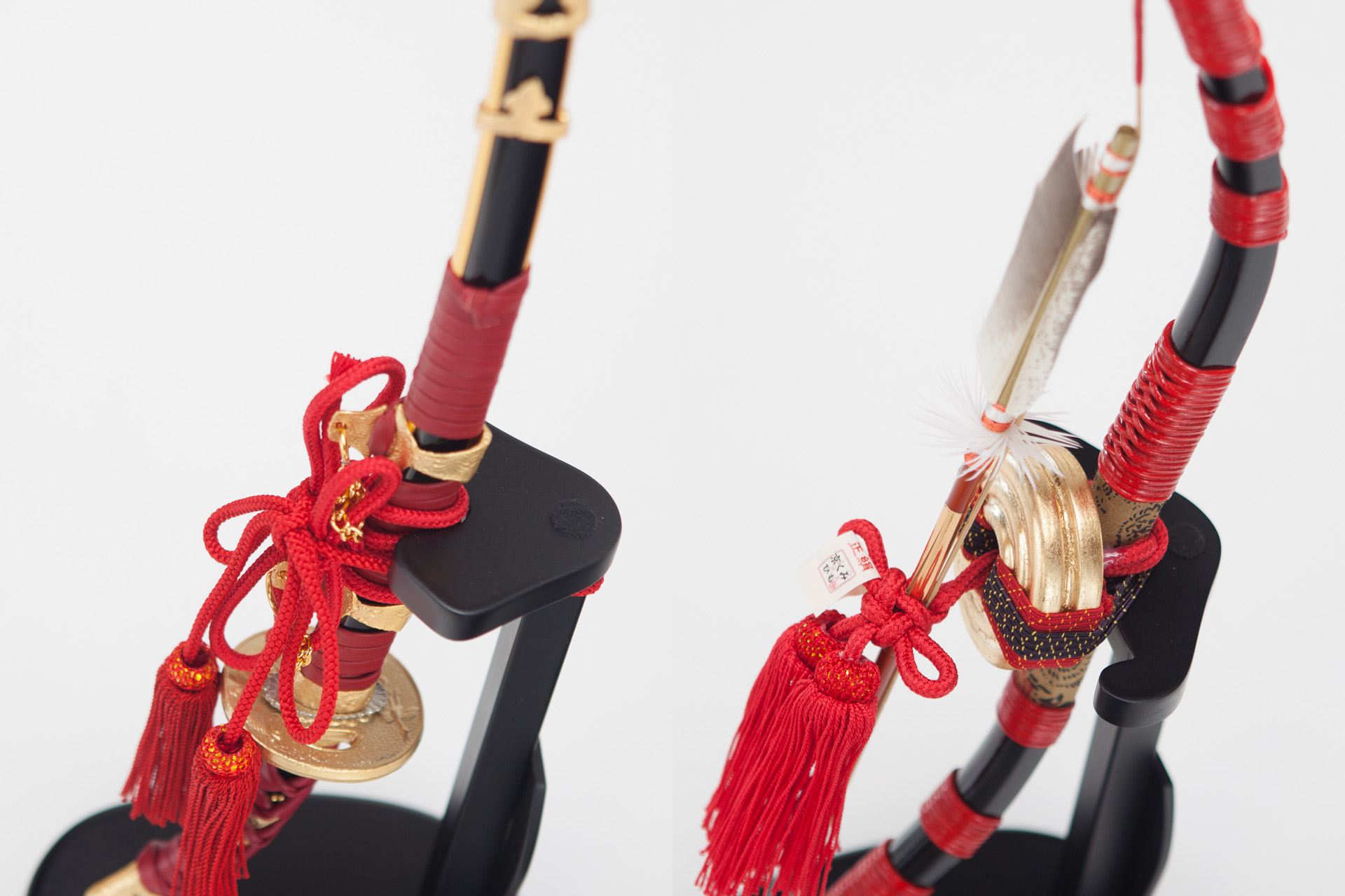 太刀には牛革が装飾され、弓矢は籐巻きの赤漆仕立てになっています。