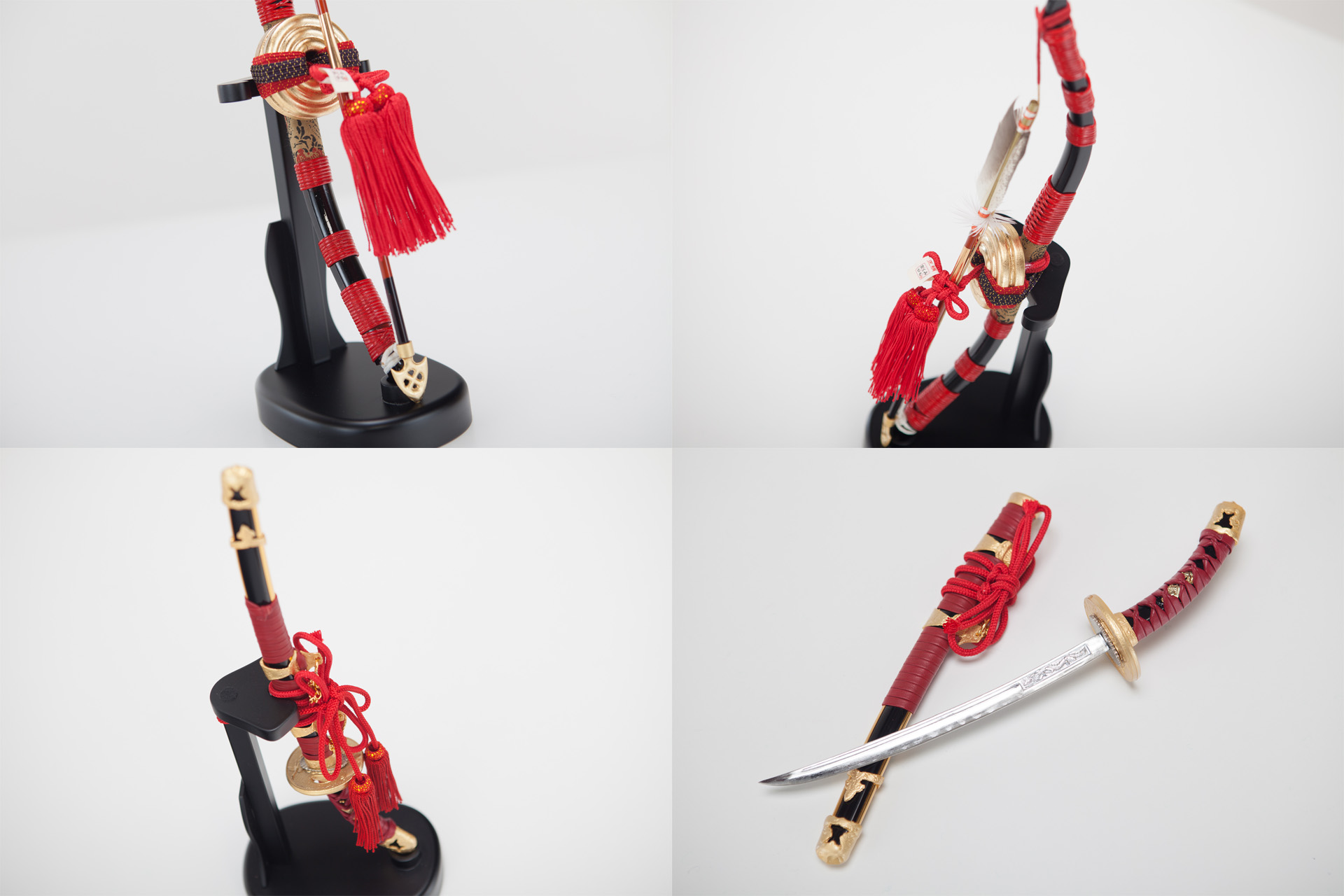 太刀には牛革が装飾され、弓矢は籐巻きの赤漆仕立てになっています。
