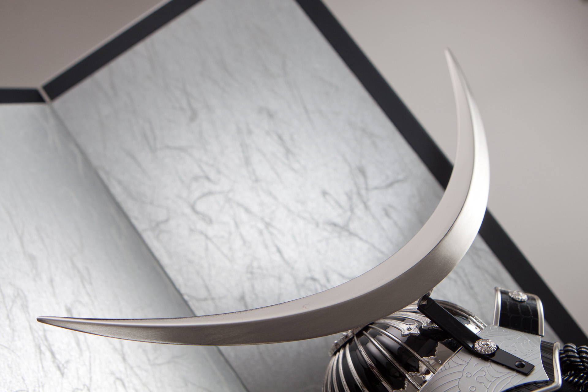 斬新をテーマに制作した兜飾り「斬-SILVER-」バージョンです。兜の前立ては、今までにない洗練されたシャープなデザイン。光沢と艶消しのコンビ鍍金仕上げになっており、威しに使っております糸は黒銀ラメ糸威しになっております。屏風は和紙入りの銀屏風を組み合わせております。お部屋のインテリアとして置いてもおかしくはないスタイリッシュな兜飾りになっております。