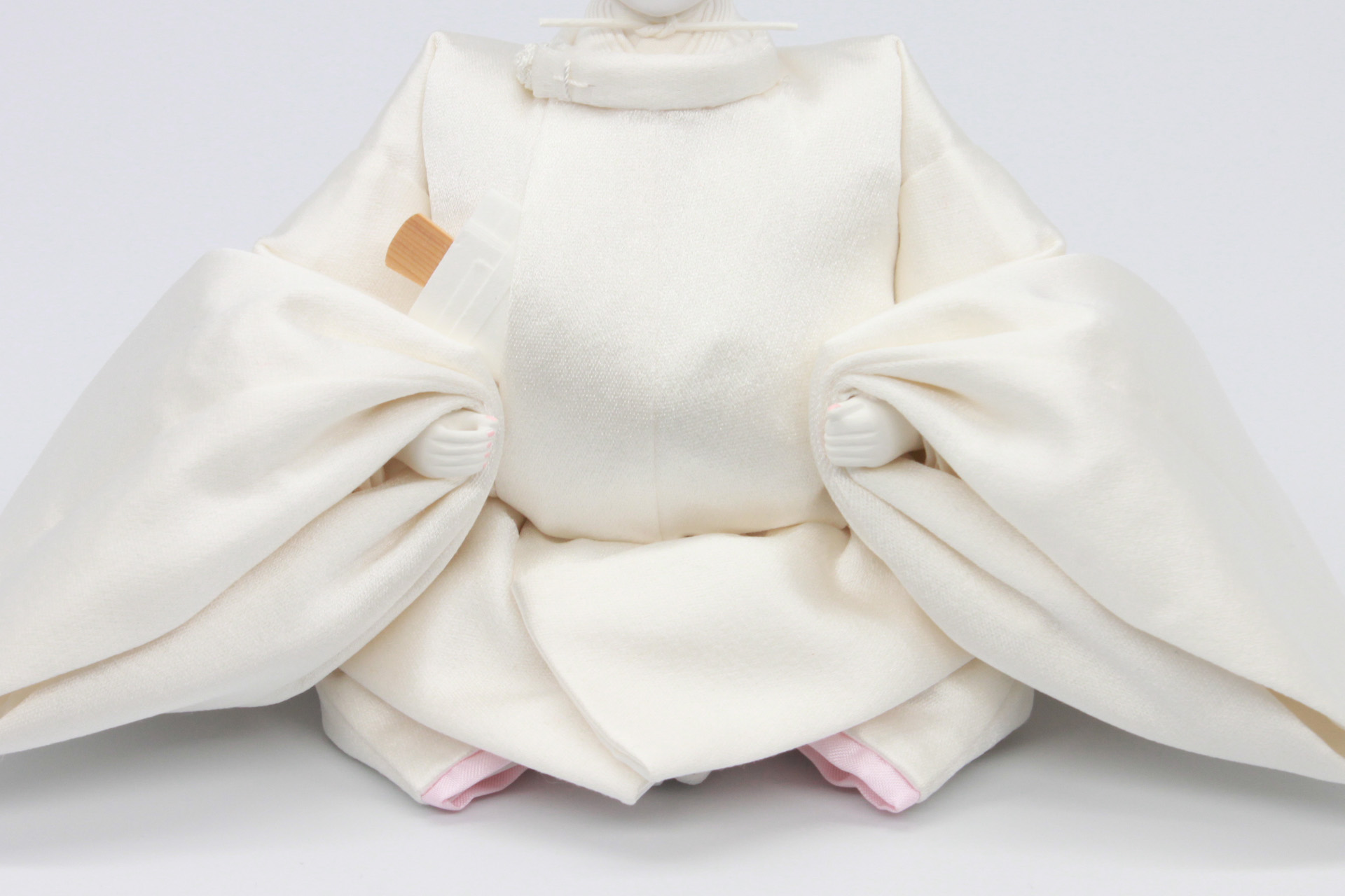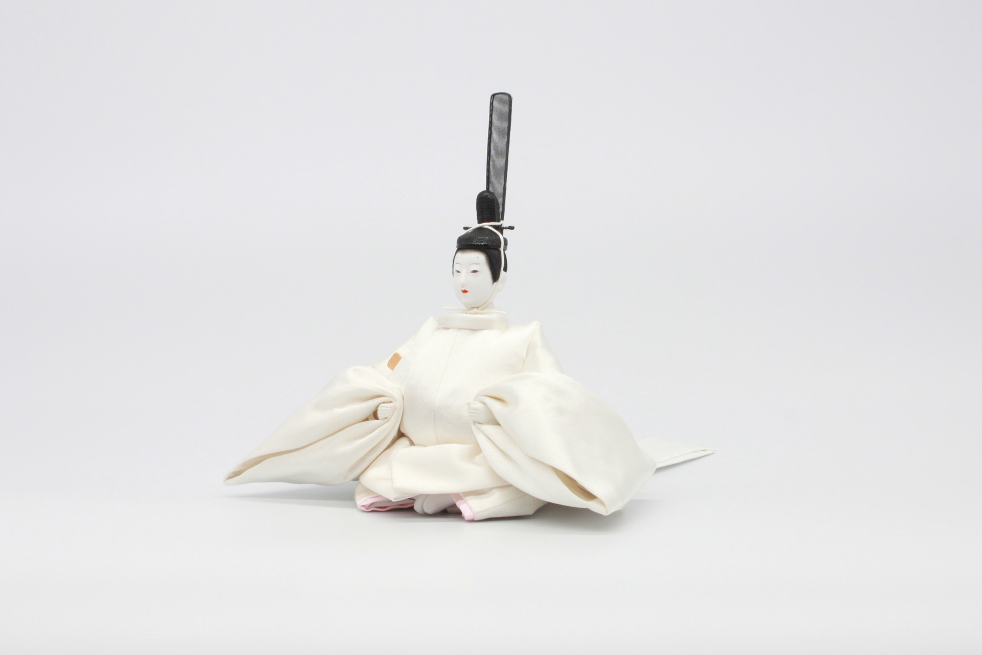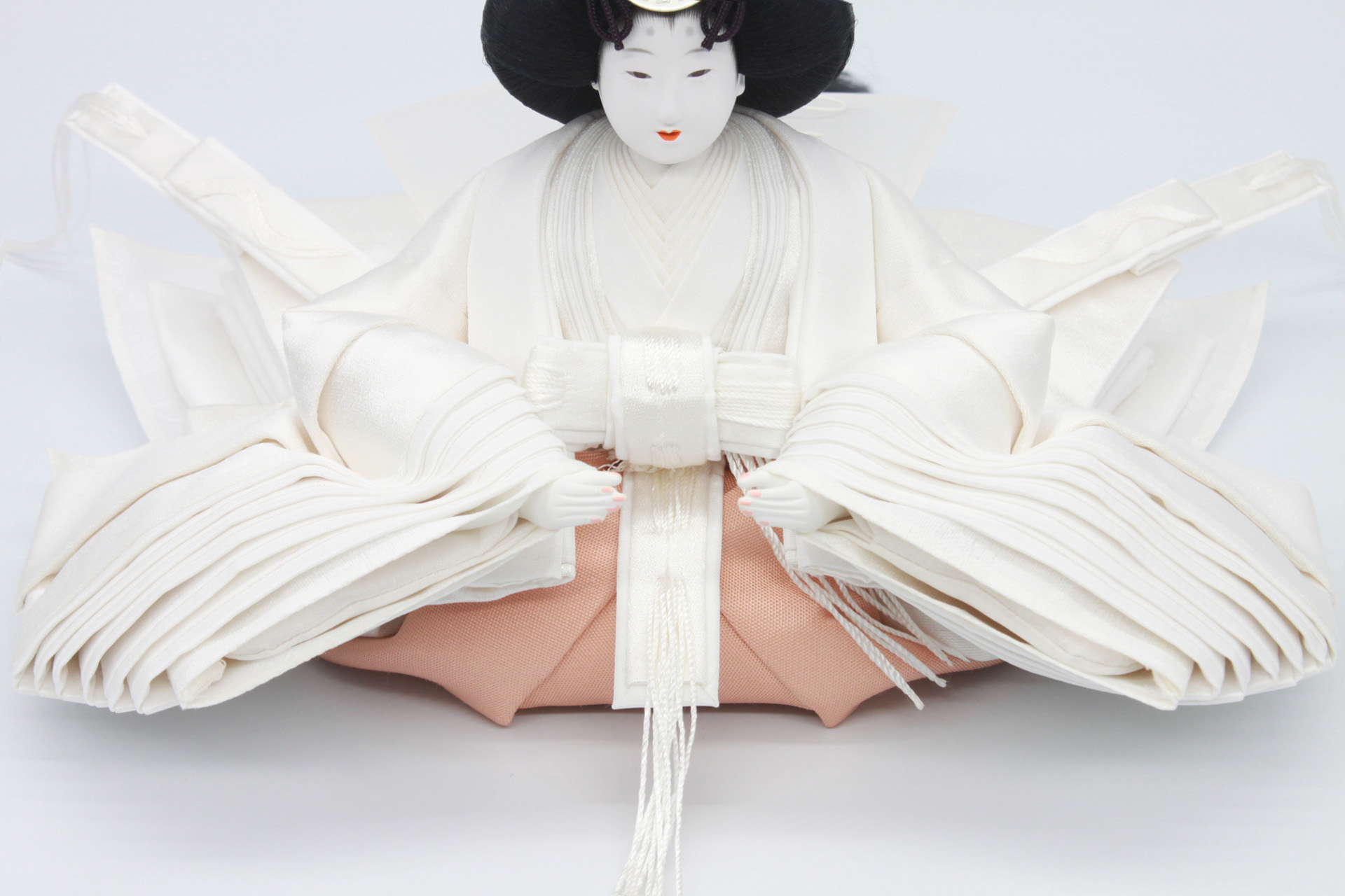 帛御袍 (はくのごほう) とは天皇陛下の神事服のこと。帛御服(はくのごふく)、帛衣(はくのきぬ) 、帛御装束とも呼ばれる。賢所大前の儀、大嘗祭などにお召しになります。白地無文の袍を帛御袍といい、嵯峨天皇の神事の際に御服と定められ、表裏ともに純白の絹。表袴の裏だけが薄紅色になっている。現在帛の十二単は、江戸時代に女帝が神事にお召しになったもので、皇后陛下の儀式服としては、大正の御大礼から制定された。冠の黒と表袴の裾にわずかにのぞく裏地の薄紅とが、全身の純白を引き立てるたいへん清浄な装束をお雛様で再現しました。