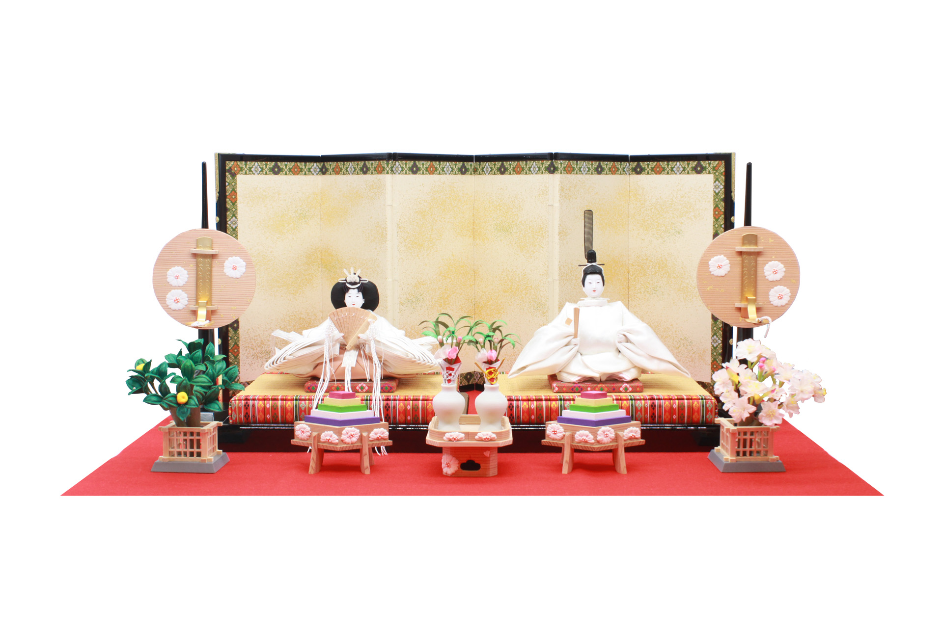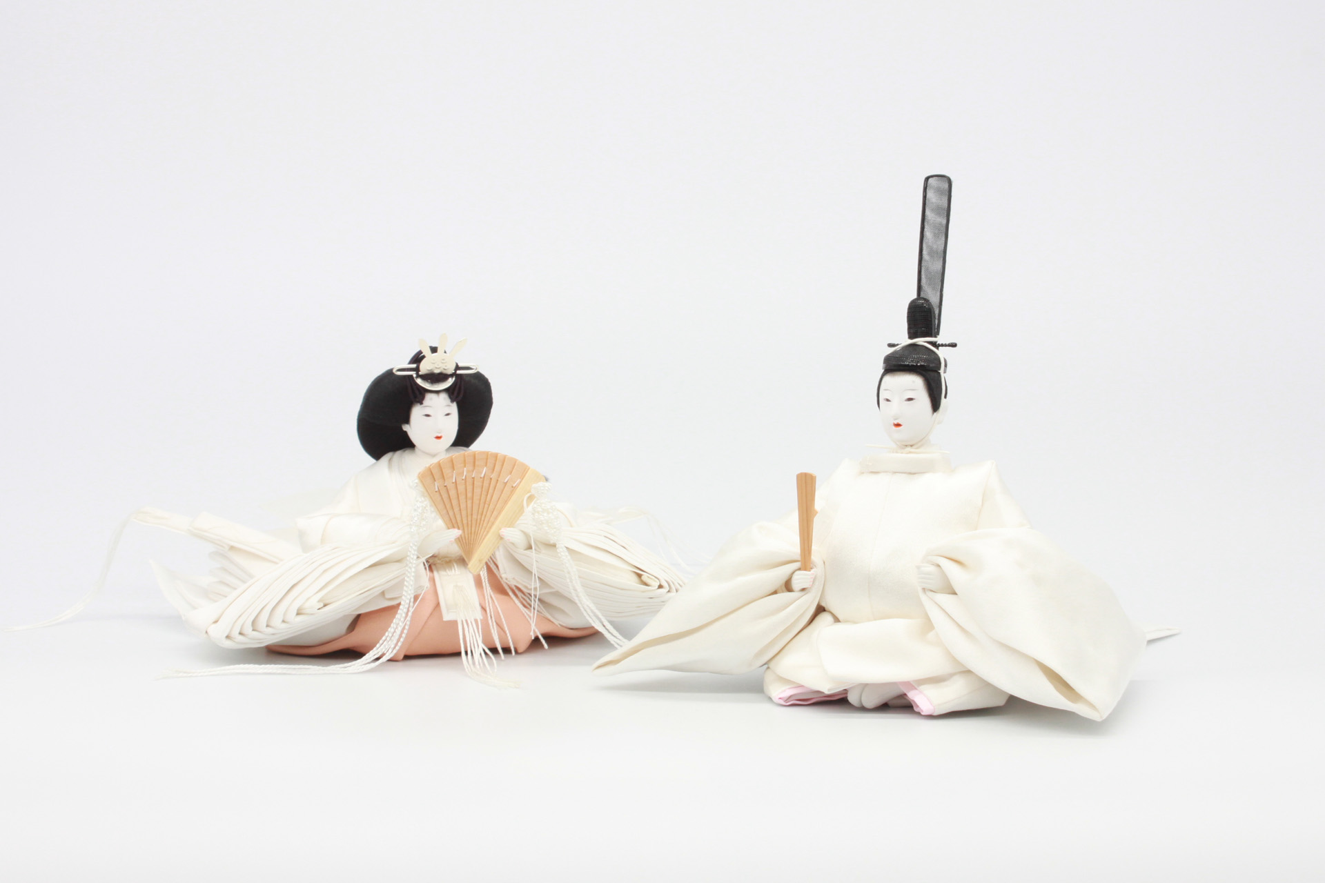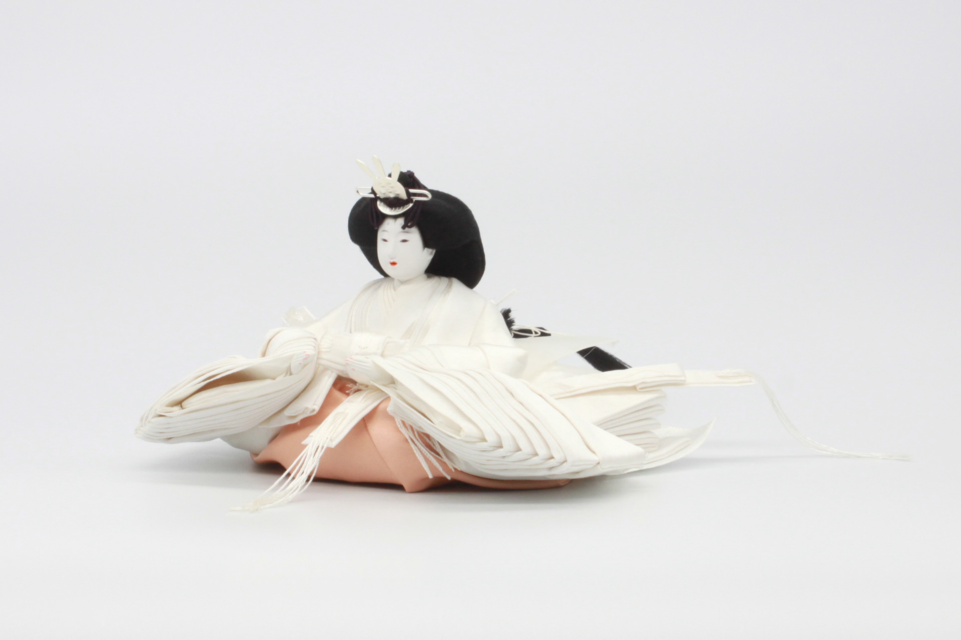 帛御袍 (はくのごほう) とは天皇陛下の神事服のこと。帛御服(はくのごふく)、帛衣(はくのきぬ) 、帛御装束とも呼ばれる。賢所大前の儀、大嘗祭などにお召しになります。白地無文の袍を帛御袍といい、嵯峨天皇の神事の際に御服と定められ、表裏ともに純白の絹。表袴の裏だけが薄紅色になっている。現在帛の十二単は、江戸時代に女帝が神事にお召しになったもので、皇后陛下の儀式服としては、大正の御大礼から制定された。冠の黒と表袴の裾にわずかにのぞく裏地の薄紅とが、全身の純白を引き立てるたいへん清浄な装束をお雛様で再現しました。