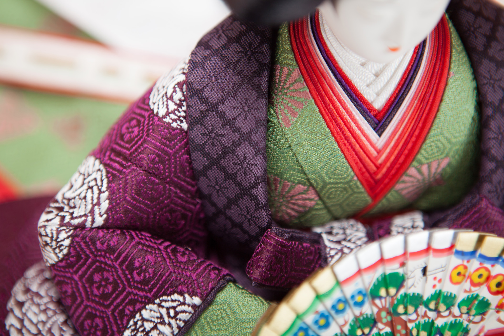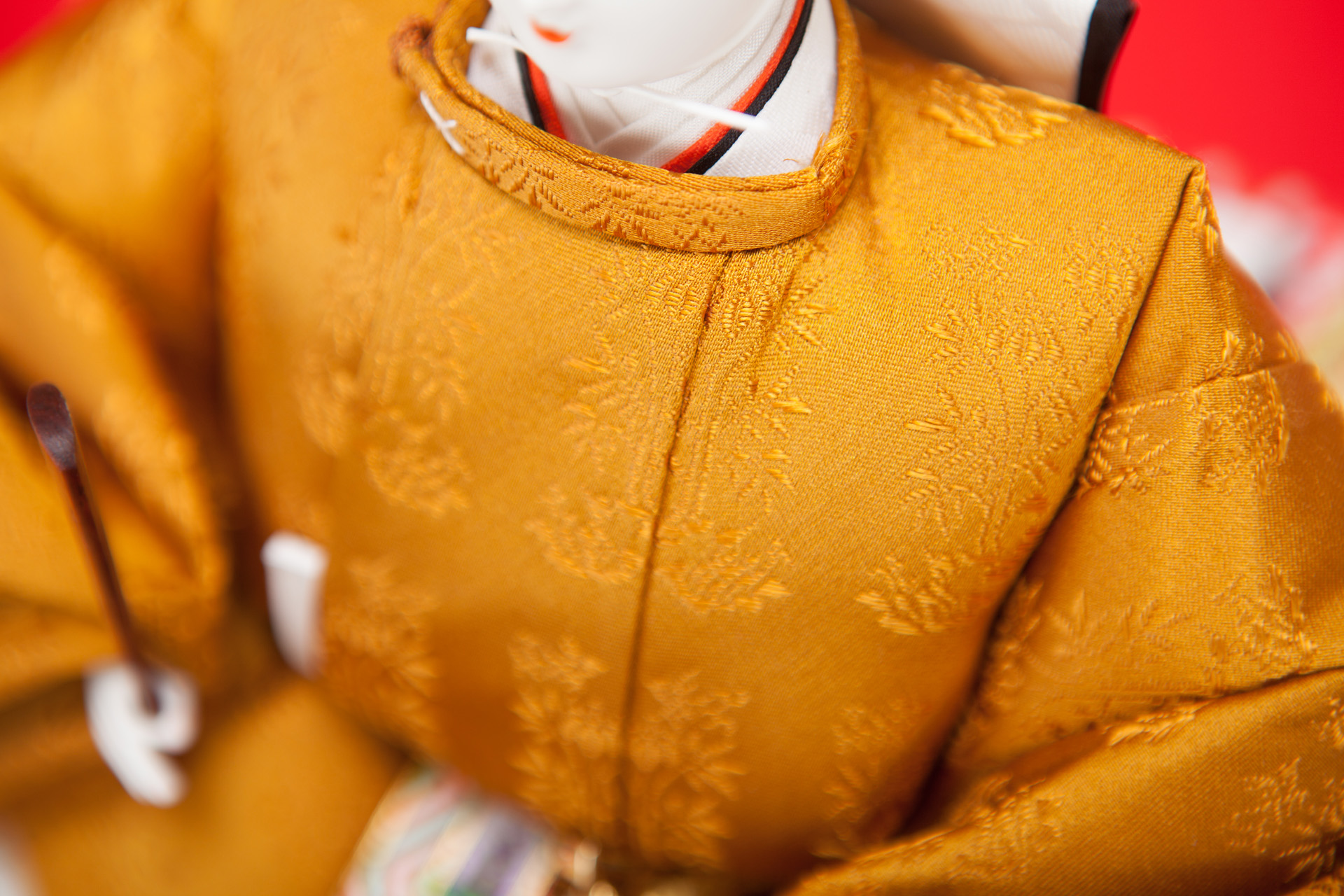 男雛の装束は、今日まで継承されている格調高い正絹の「黄櫨染」で制作。