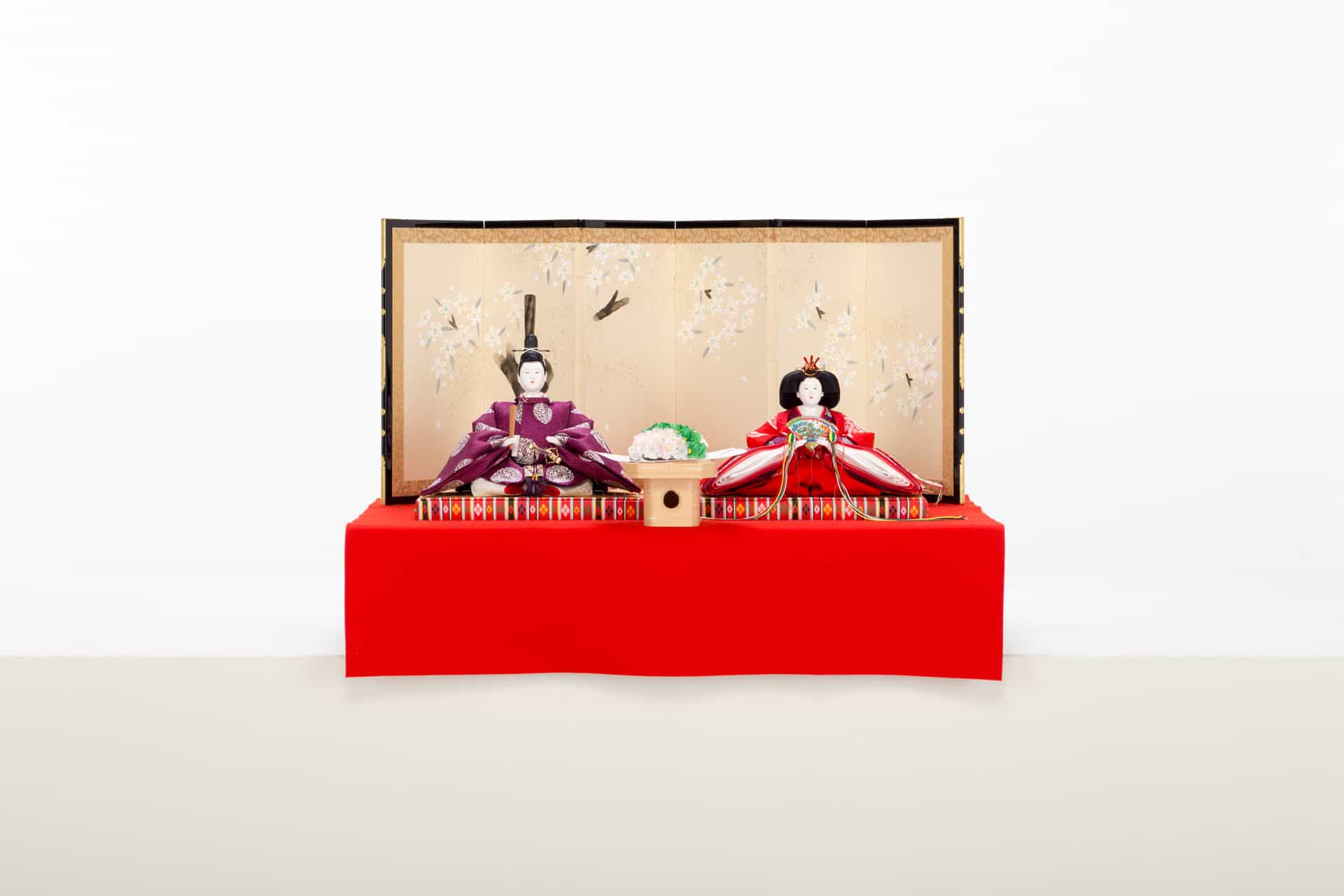 シンプルに飾り付けした親王飾りです。男雛と女雛の衣装には「亀甲唐花唐鳥丸(キッコウカラハナニカラトリマル)」を使用。亀は長寿の象徴として吉祥文様の代表とも言え、有職文様でも様々なパターンで使用されております。屏風は、京都で丁寧に手描きで描かれた桜の屏風を組み合わせました。お雛様の色目と屏風の落ち着いた色目がとても美しい雛飾りです。
