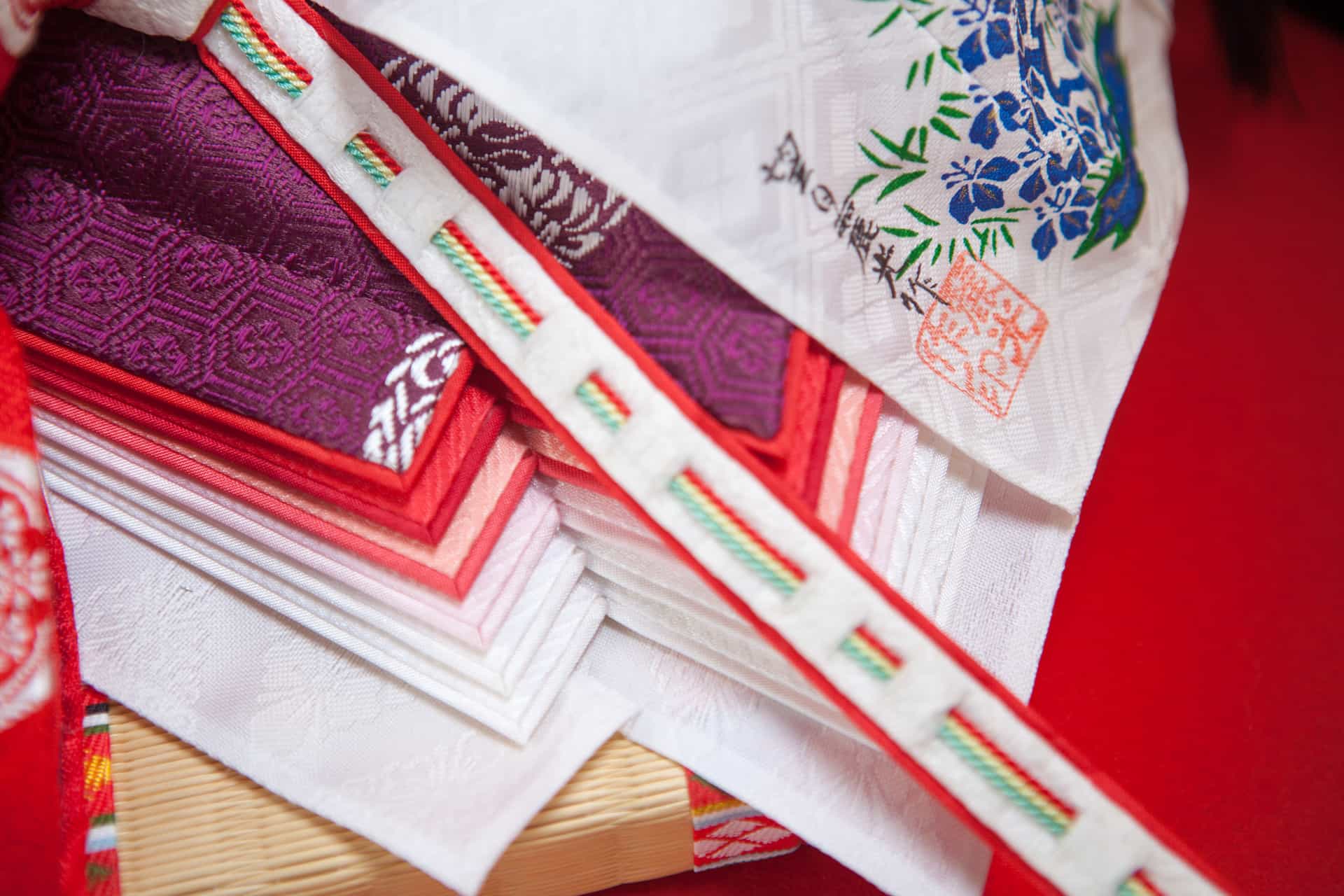 女雛の唐衣文様は、「入子菱窠中八曜菊(イリコヒシニカノナカハチヨウキク)」。八曜は古代インドの九曜曼荼羅信仰からきており、大円を中心にして、八個の小円を周囲に配列した図柄となっている。 曜=星は天体を変わらぬ規則で巡る星への信仰を形とし、北極星の周りを巡る北斗七星を象ったもの。さらに日本独自の形として菊を用いた。