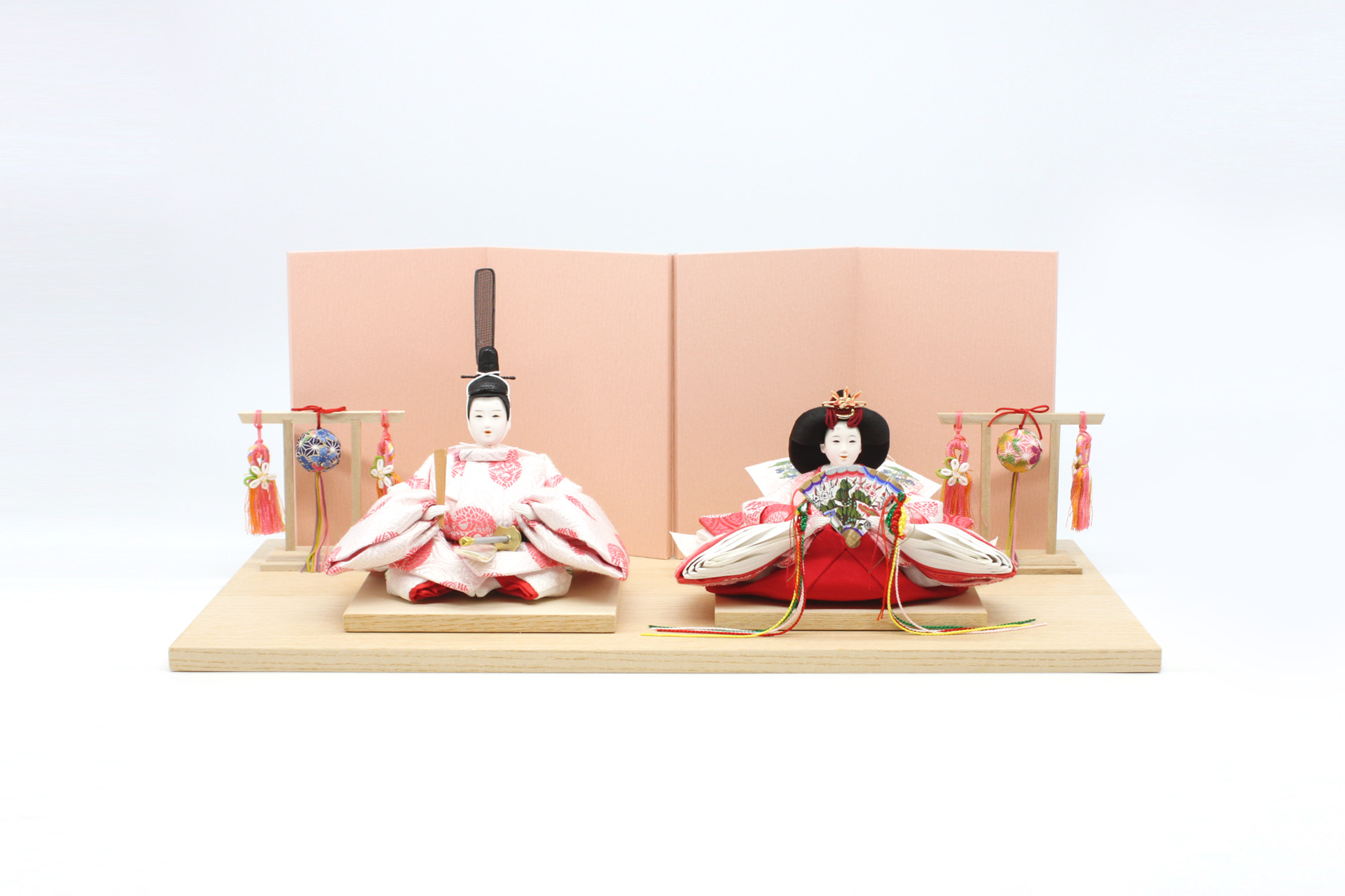 リビングのサイドボードにも飾れそうな間口50cmの親王飾りです。可愛らしい色目を使った親王にまり飾りを組み合わせたシンプルなセットです。