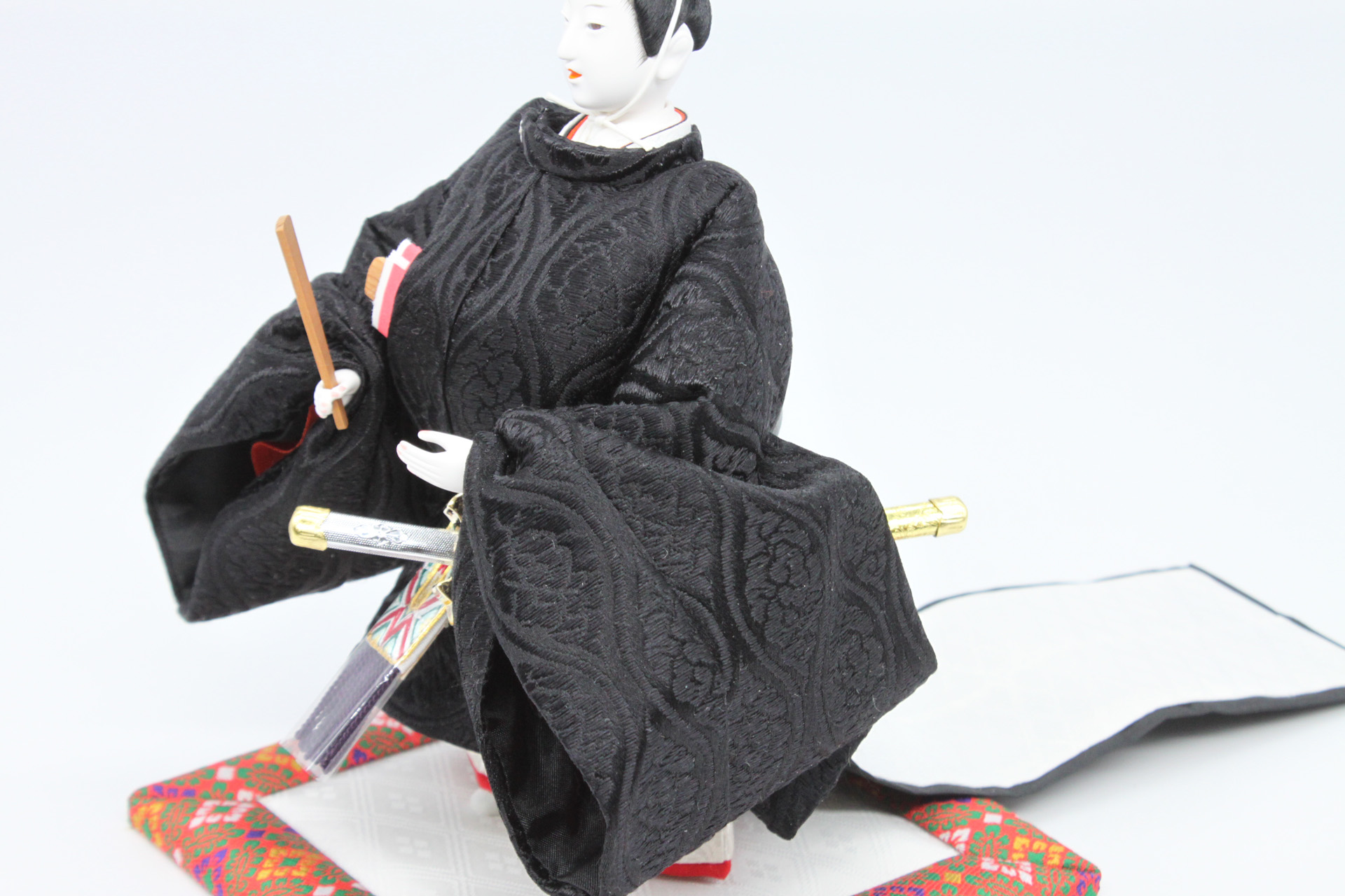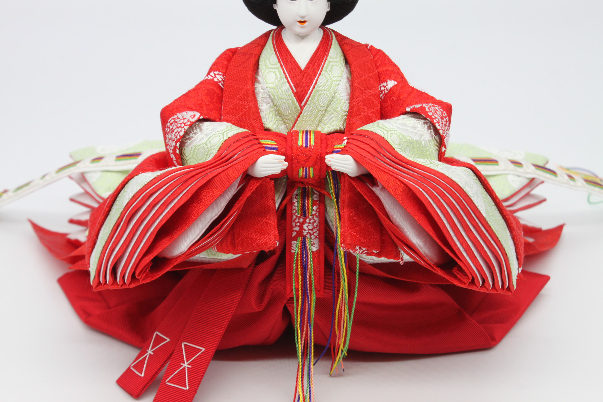 本作品を製作するにあたり高松宮妃のお雛様を研究し、同じ衣装柄を京都の機屋に別注で織っていた特殊な柄です。