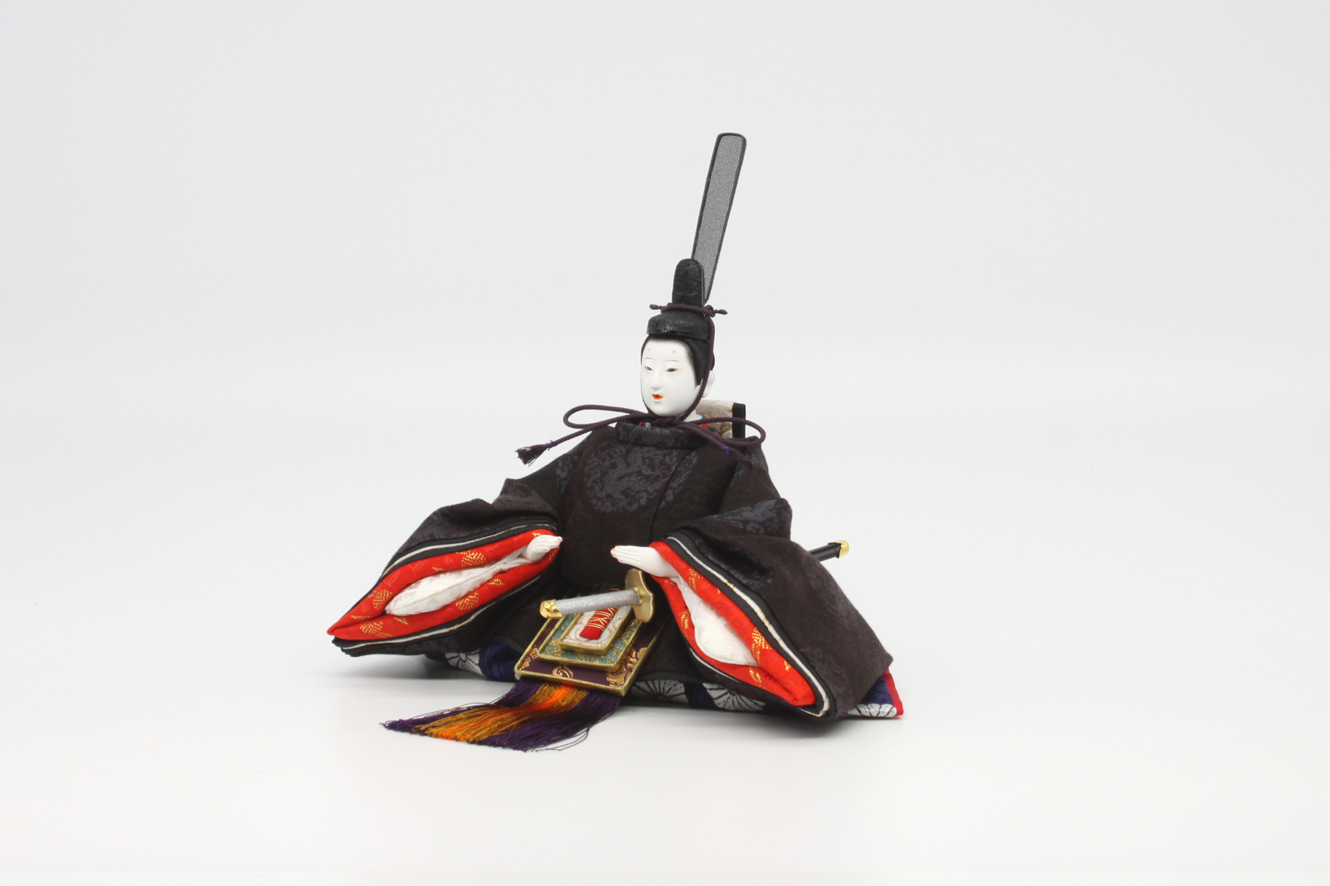 静岡伝統型のお雛様「駿河雛人形」です。静岡(県中部地区)では約120年ほど前に天神人形(志太天神)が誕生し、その作りを継承して作り始められたのがこのお雛様「駿河雛人形」です。もともと大型のお雛様(一抱えする大きさ)が本来のサイズですが住宅事情に合わせ小さなサイズを製作。小さなサイズながら伝統技術を凝縮した作品となっております。現在では静岡で製作されたお雛様は全て「駿河雛人形」と定義づけられておりますが、伝統的な形、仕立てなどは本作品のことを指します。また伝統的な駿河雛人形を製作している工房も当店が静岡最後の工房となります。