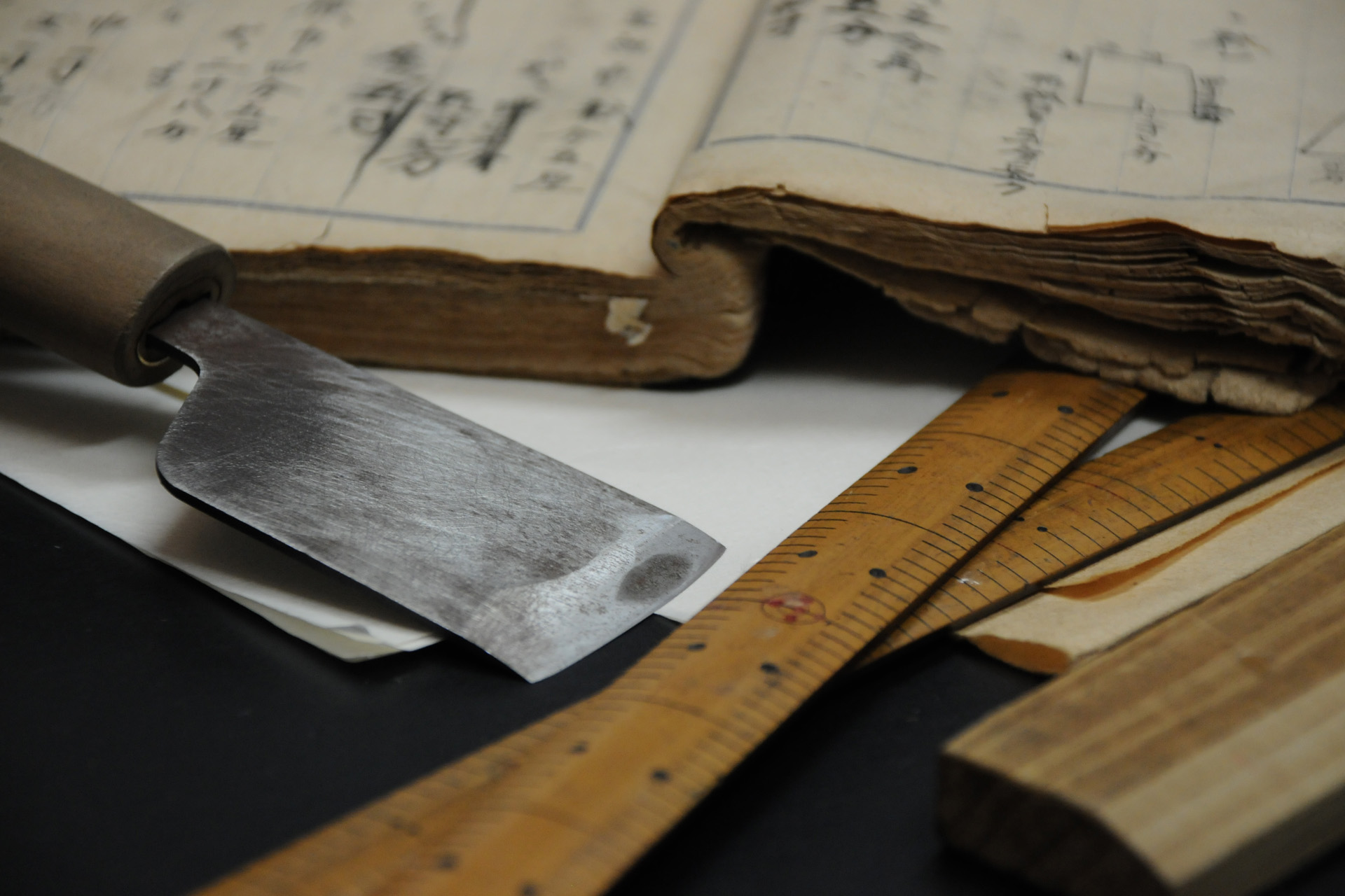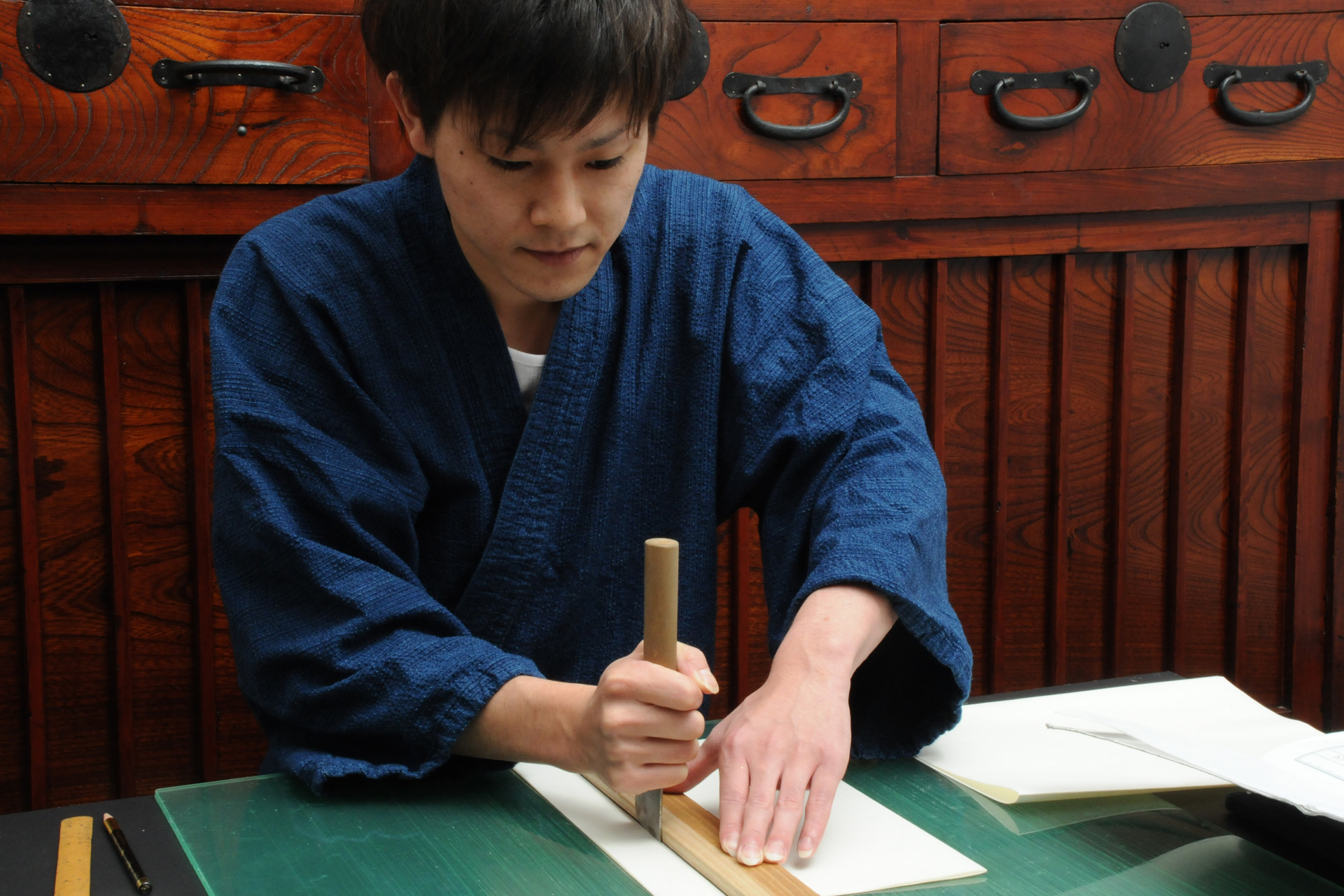 受け継がれている寸法帳を見ながらまずは、お雛様の基礎となる裏打ち用の和紙を裁断する。
