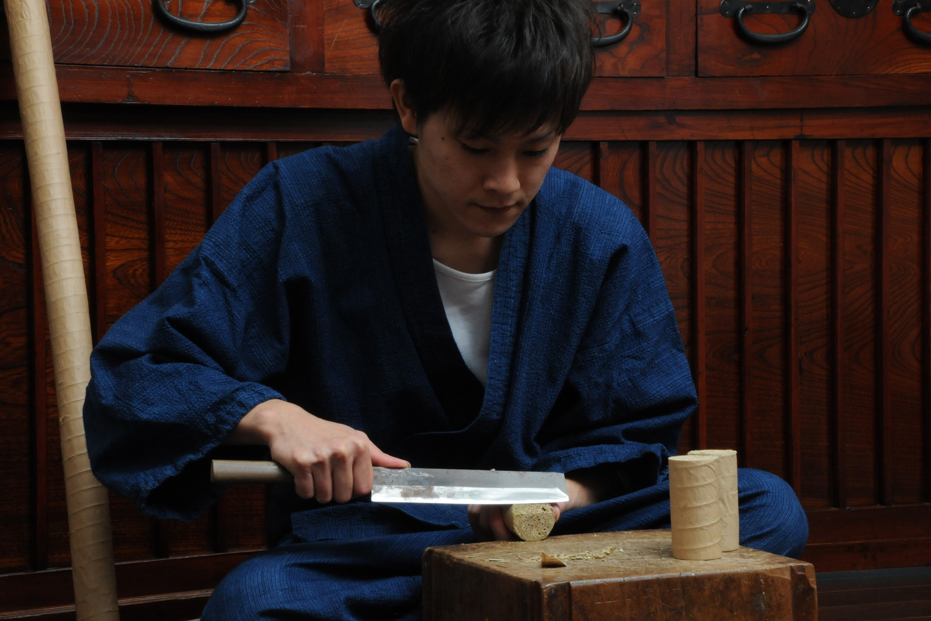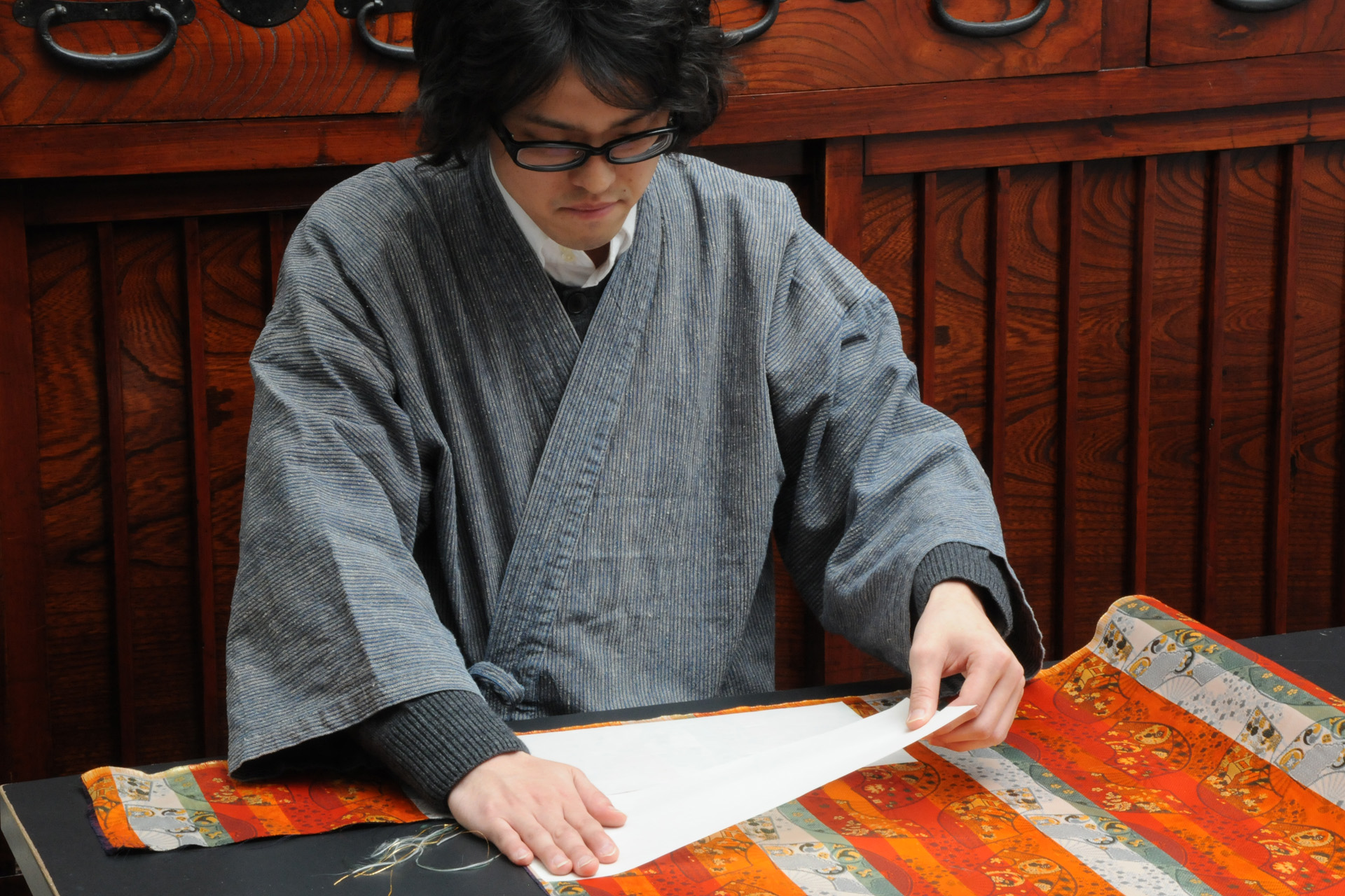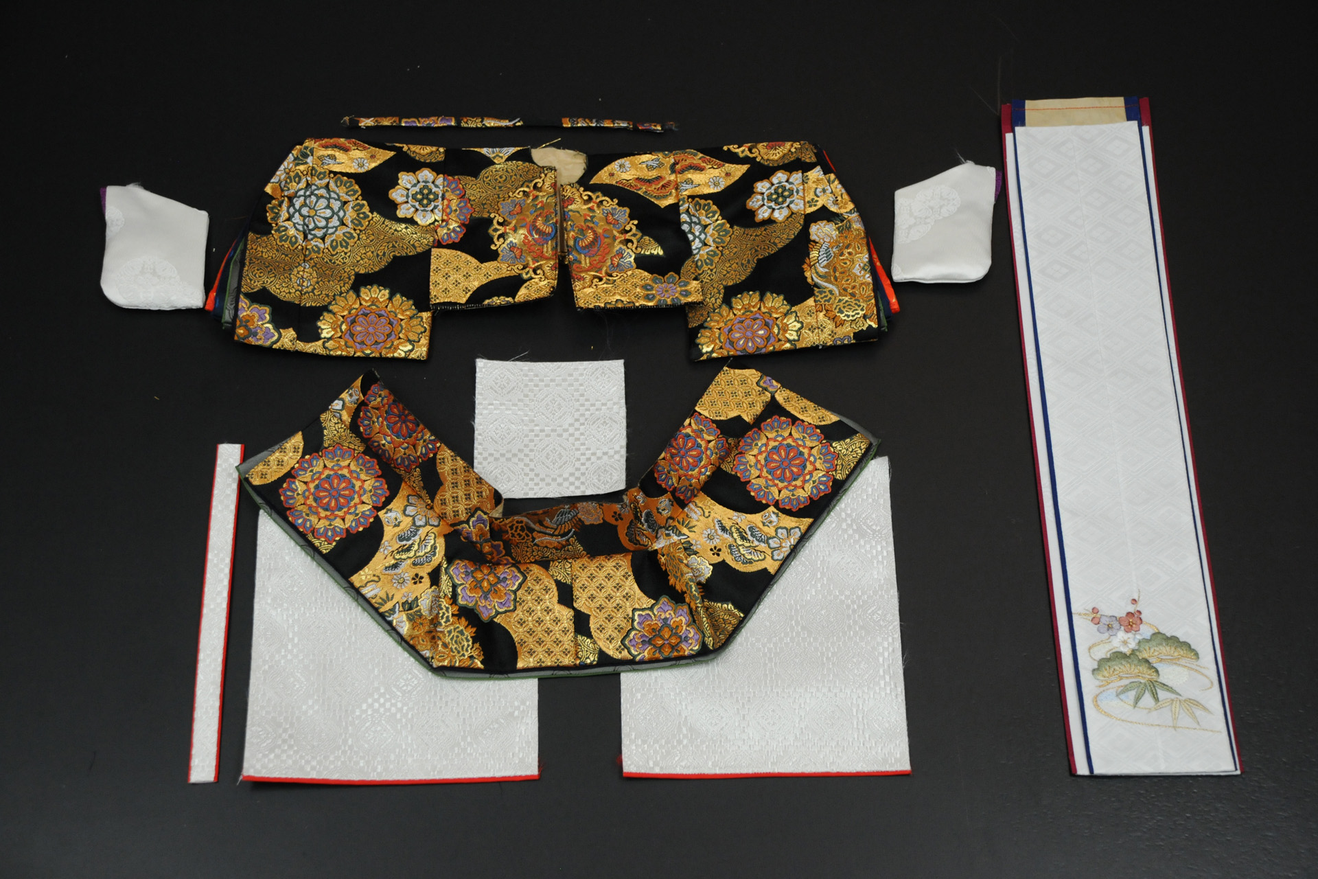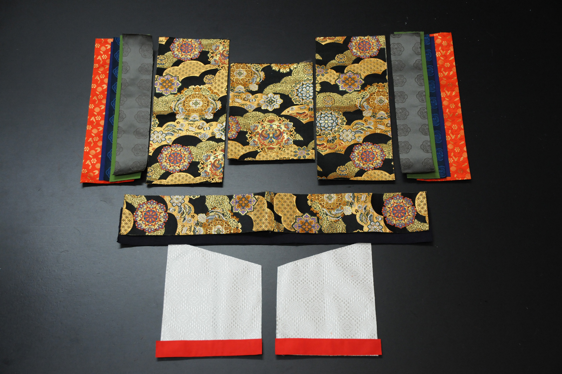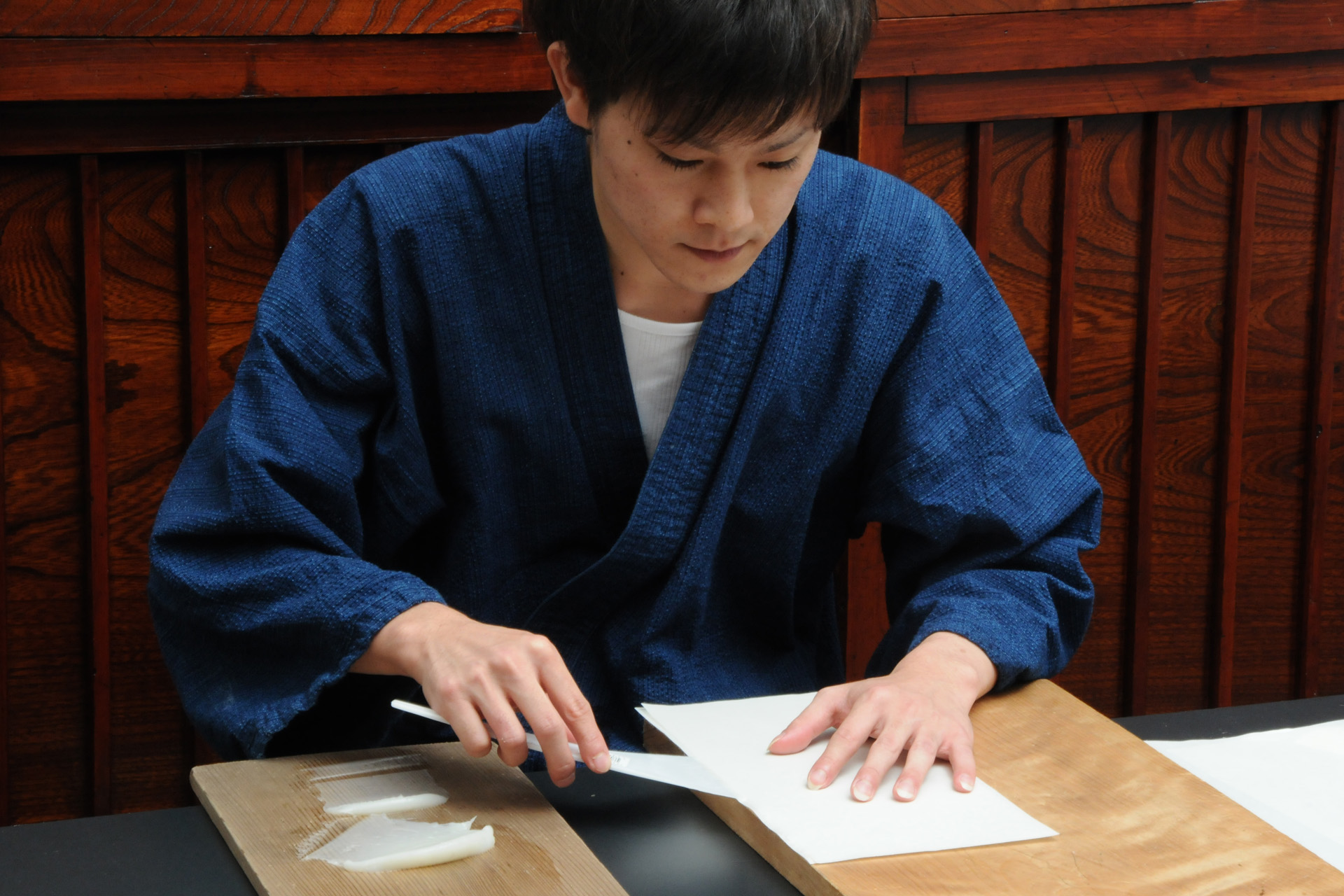衣装の生地に貼る裏打用の和紙を寸法帳に記載された寸法に合わせ裁断していく。数百種類もの基本的な寸法があり、殿で約50パーツ、姫で約120パーツが必要となる。和紙は楮入りの和紙を使用。裁断した和紙にのりを付け生地の裏に貼っていく。のりは、でんぷんのりを独自の製法で炊き、粘りを出していく。