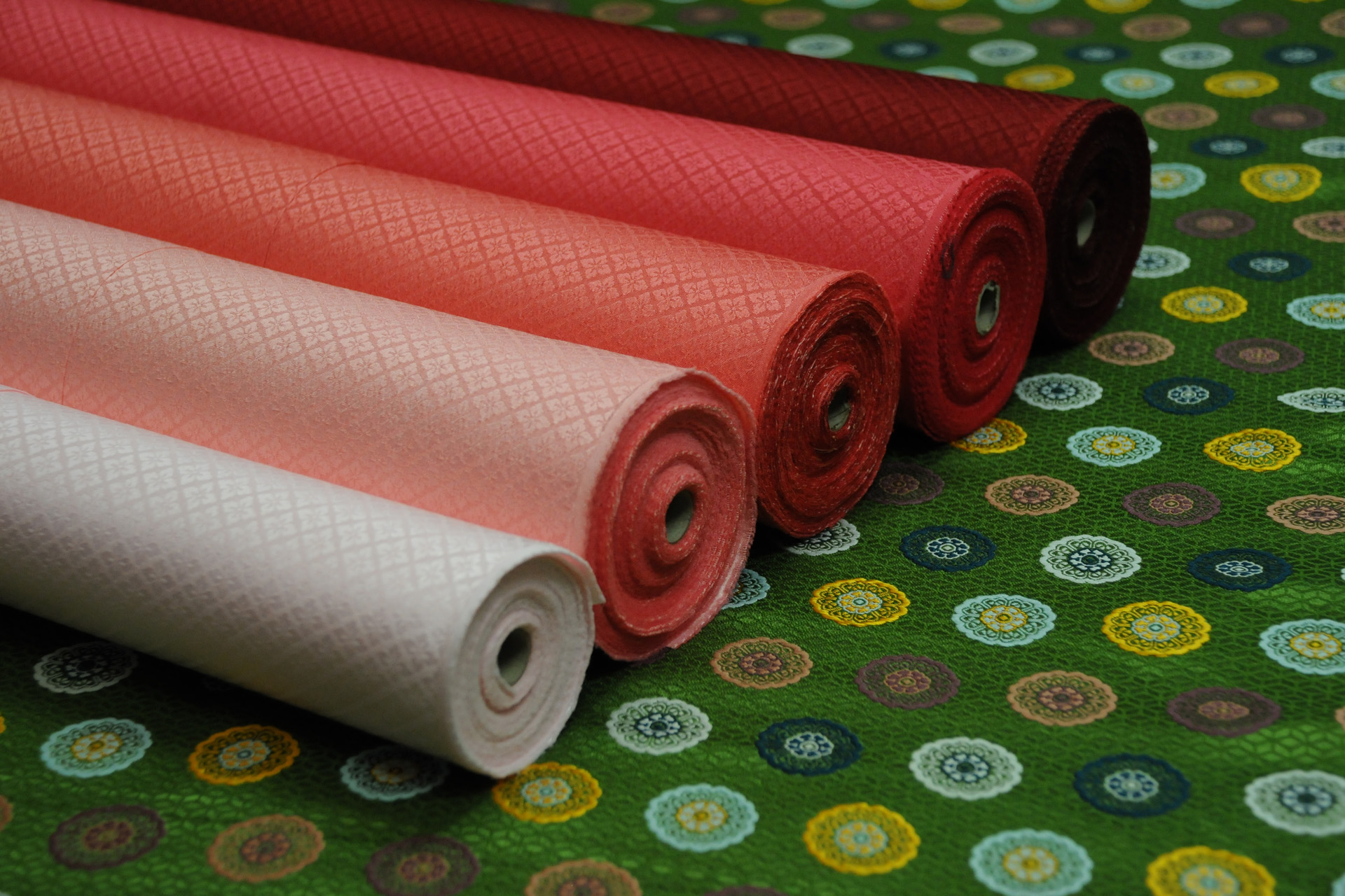 のり付けした和紙を生地に貼っていく。このときに衣装として完成した際に柄が出る様に計算しながら貼っていく。