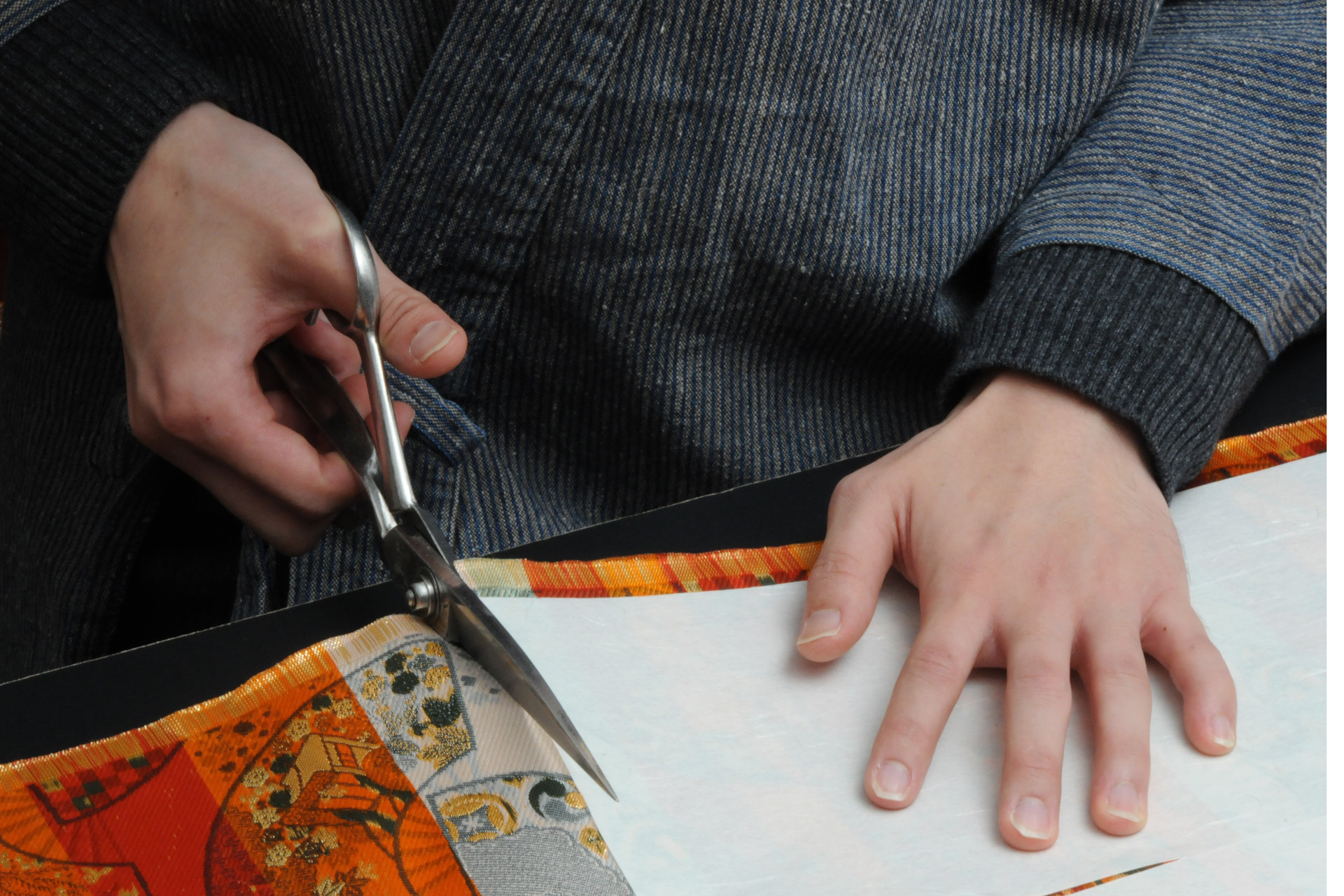衣装の生地に貼る裏打用の和紙を寸法帳を見て裁断する。そして、のりを付け生地の裏に貼り、生地を裁断する。