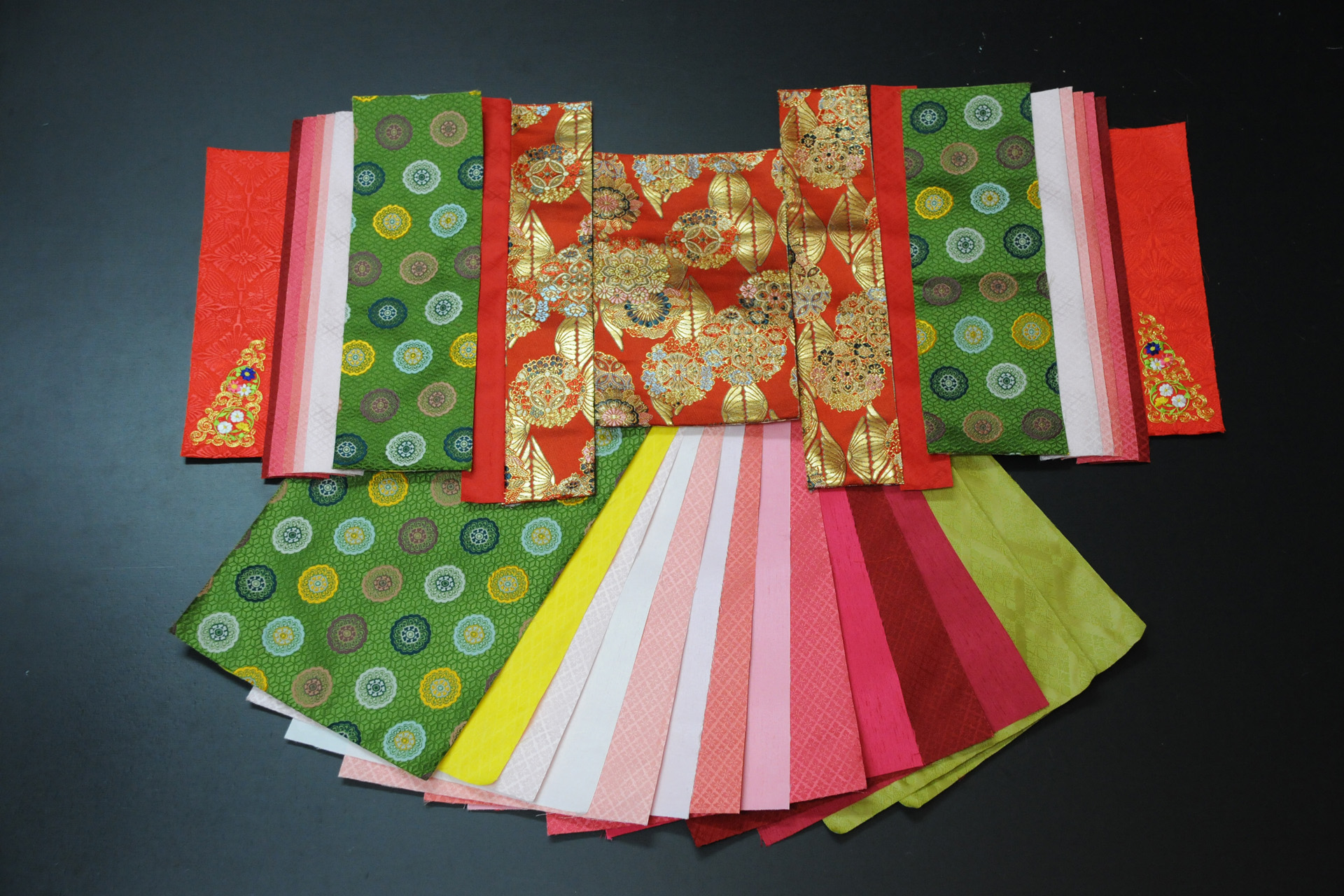 雛人形の衣装は、桐生や京都の西陣織を使用。公家が実際に使用してきた有職文様を人形用に織り、雛人形の衣装として可能な限り実際の衣装に近く仕立てる。