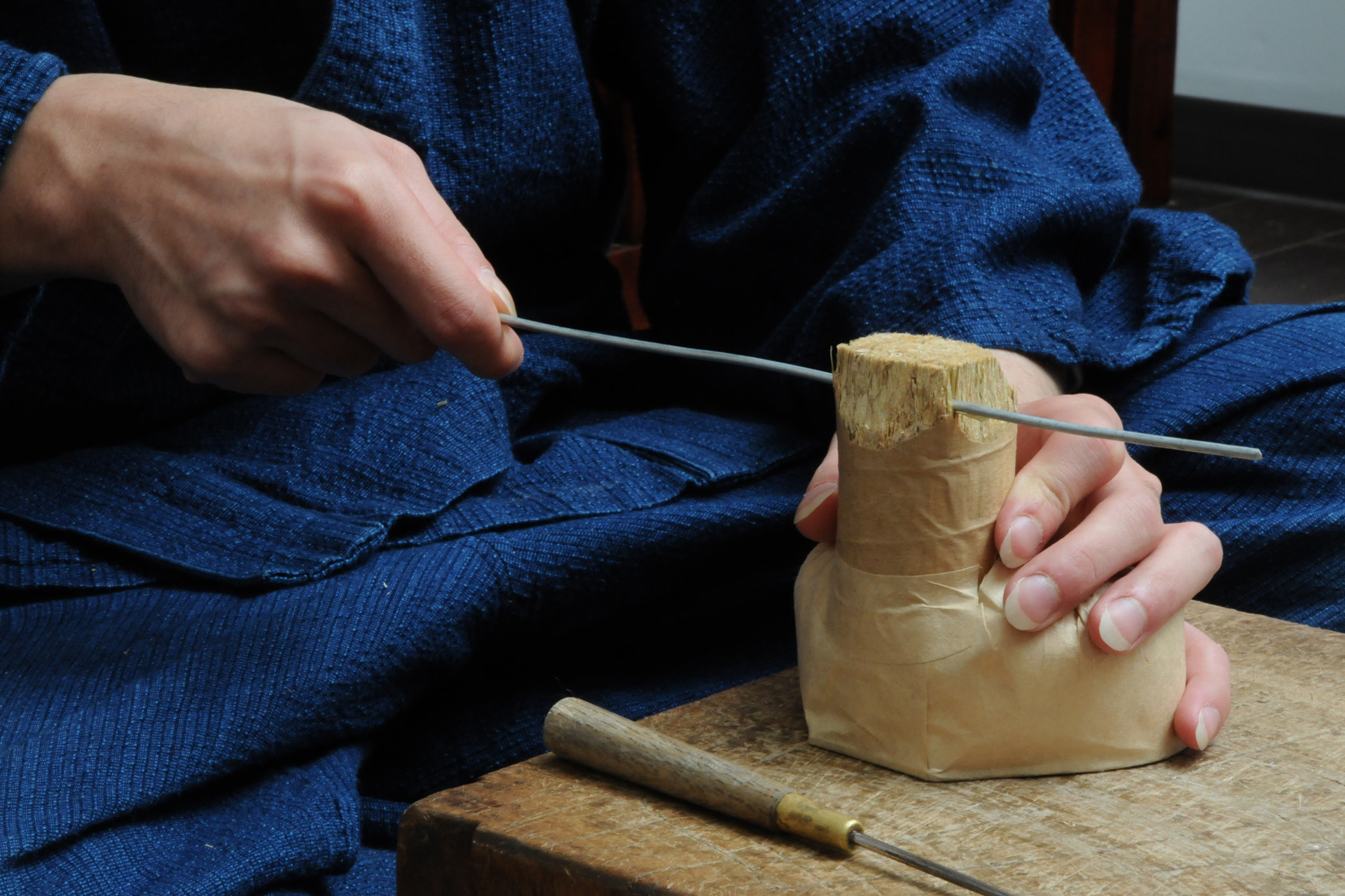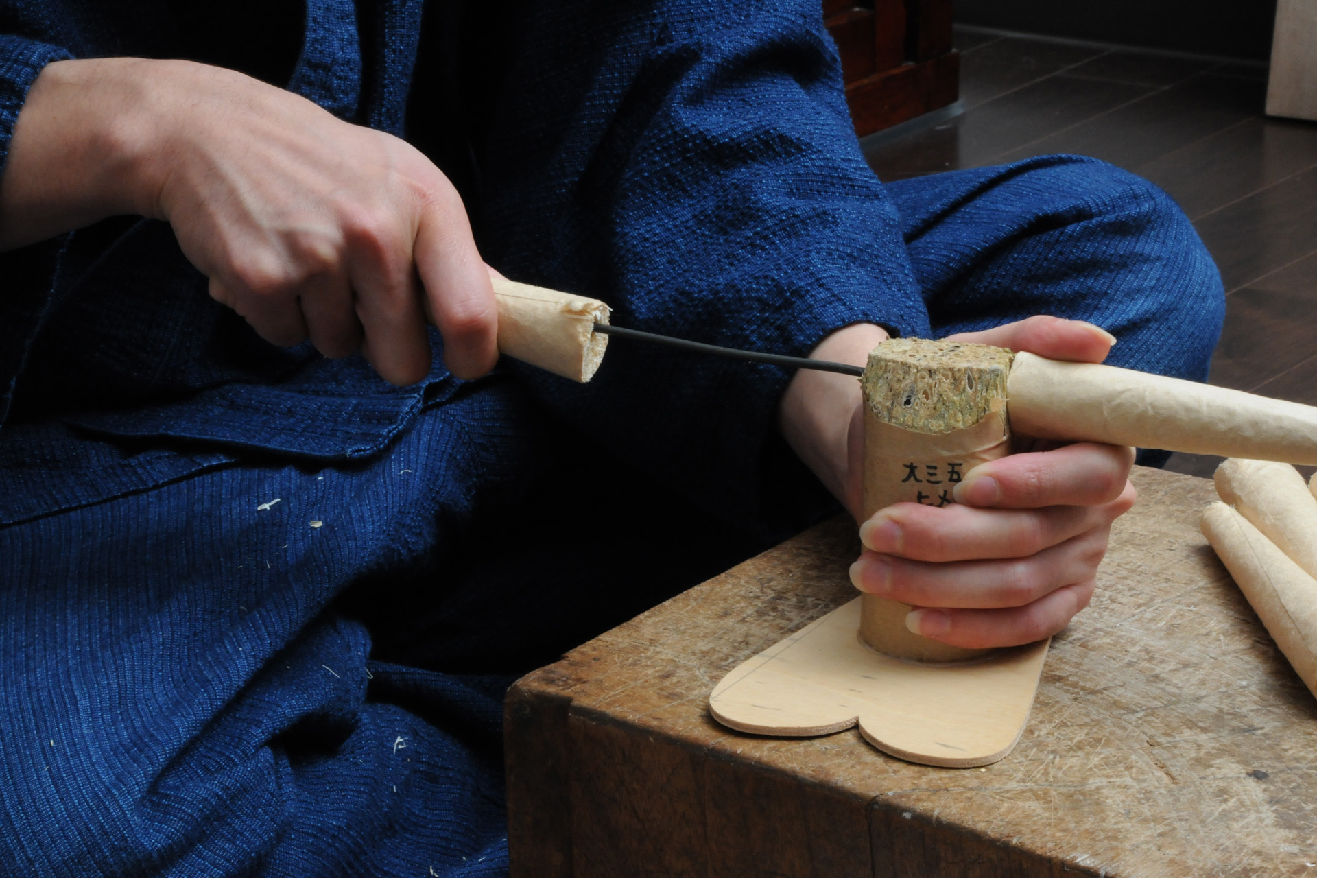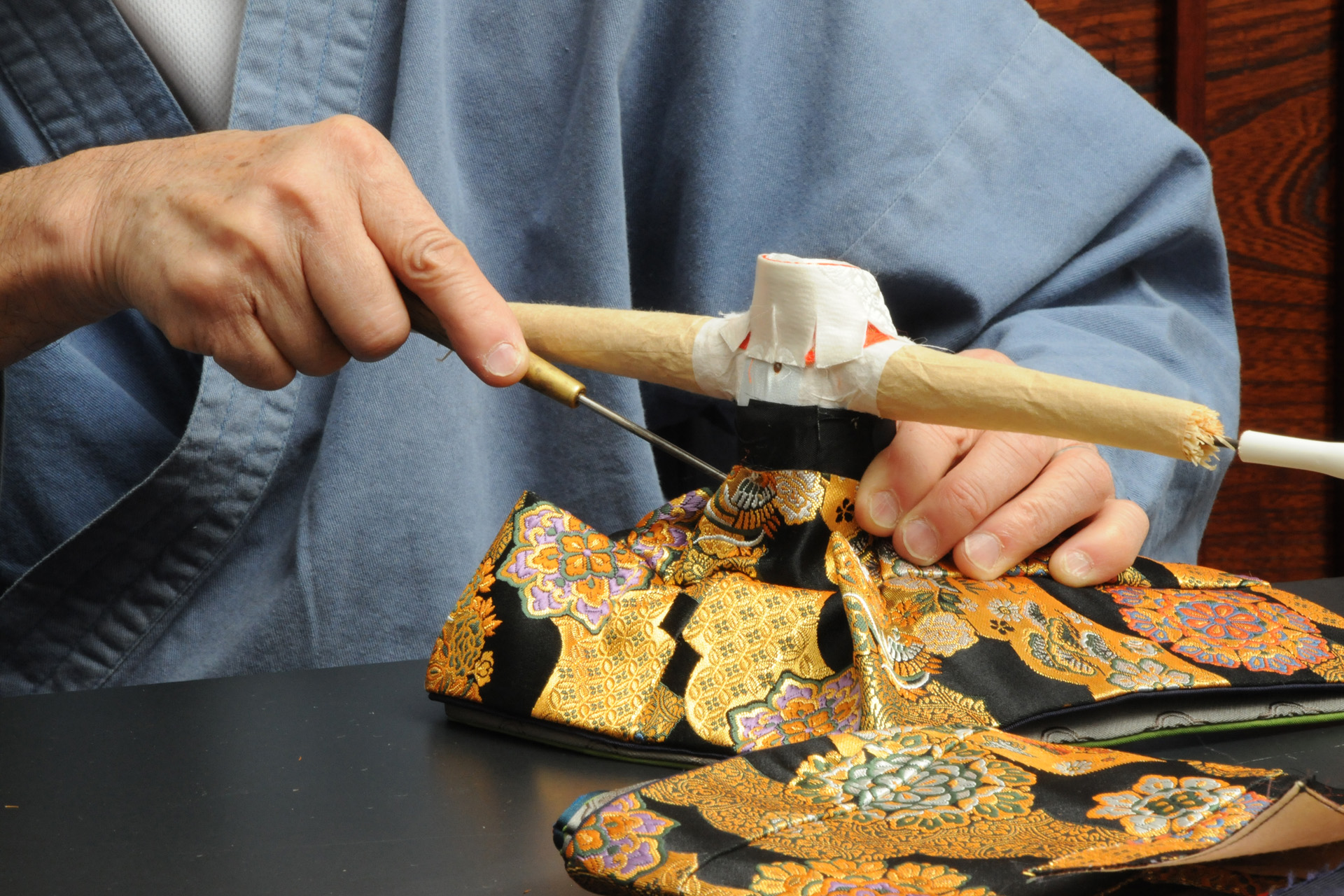 雛人形の基本となる胴体は固く重ねたワラを使用。必要な寸法に合わせ藁を裁断し、人の形に似せる様に藁を胸のカーブに合わせてカットする。腕の基本となる針金を取り付け、和紙に木毛を巻いて腕や股を制作する。出来上がった腕、股を完成した胴体に付ける。