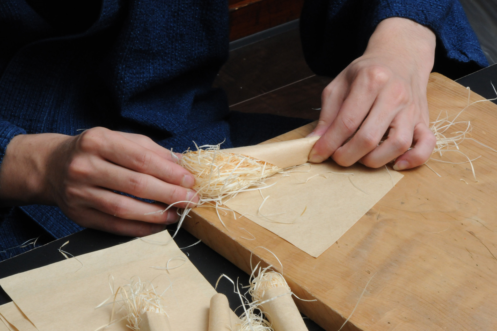 胴体は固く重ねたワラを使用。必要な寸法に合わせ裁断し、腕の基本となる針金を取り付け、木毛を巻いたものを針金に通す。