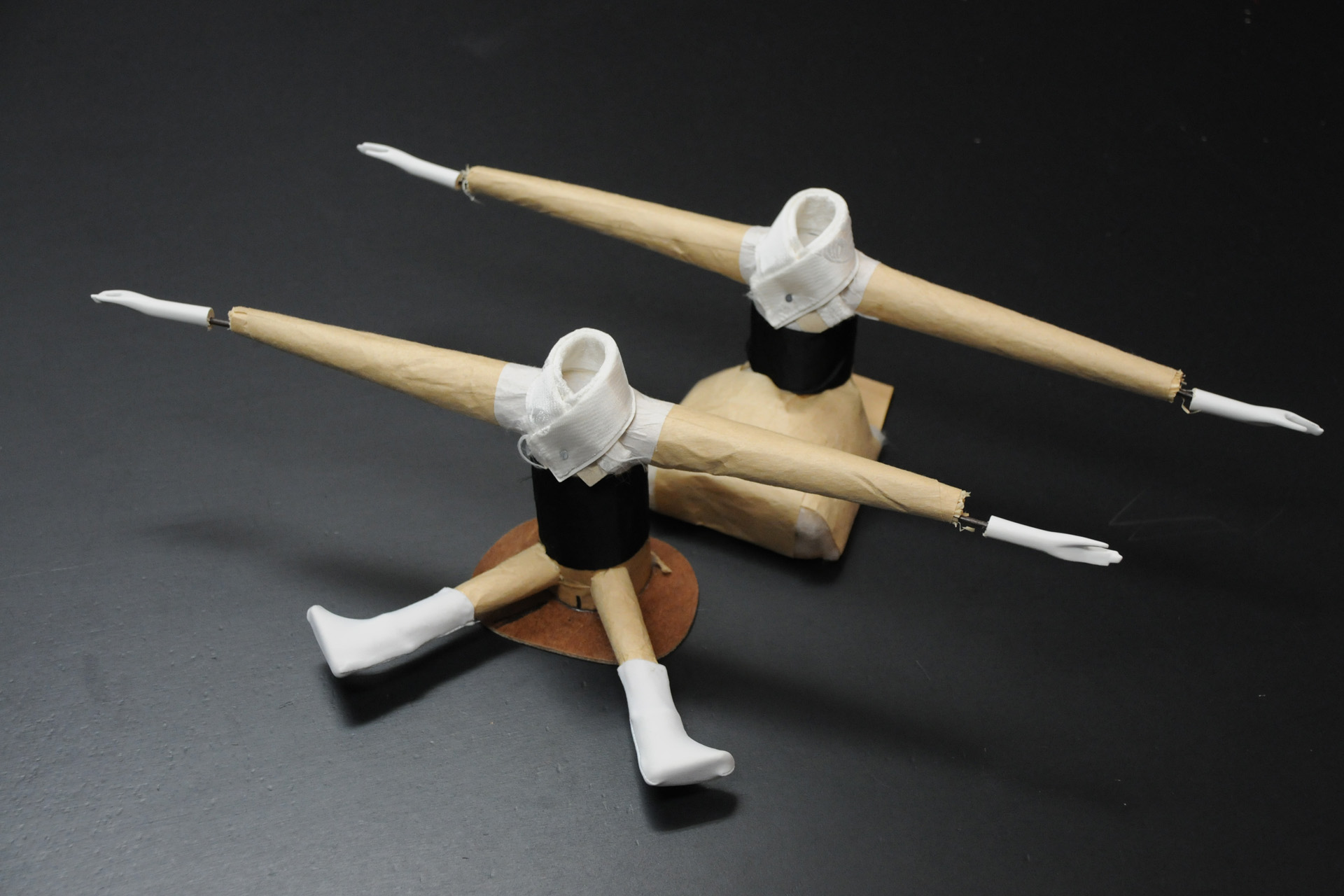 (2)で出来上がった衣装を、(3)で出来上がった胴体に着付けをする。その際、左右のバランスなどを入念にチェックしながら着付けする。そして、最後に頭や道具を取付け完成。