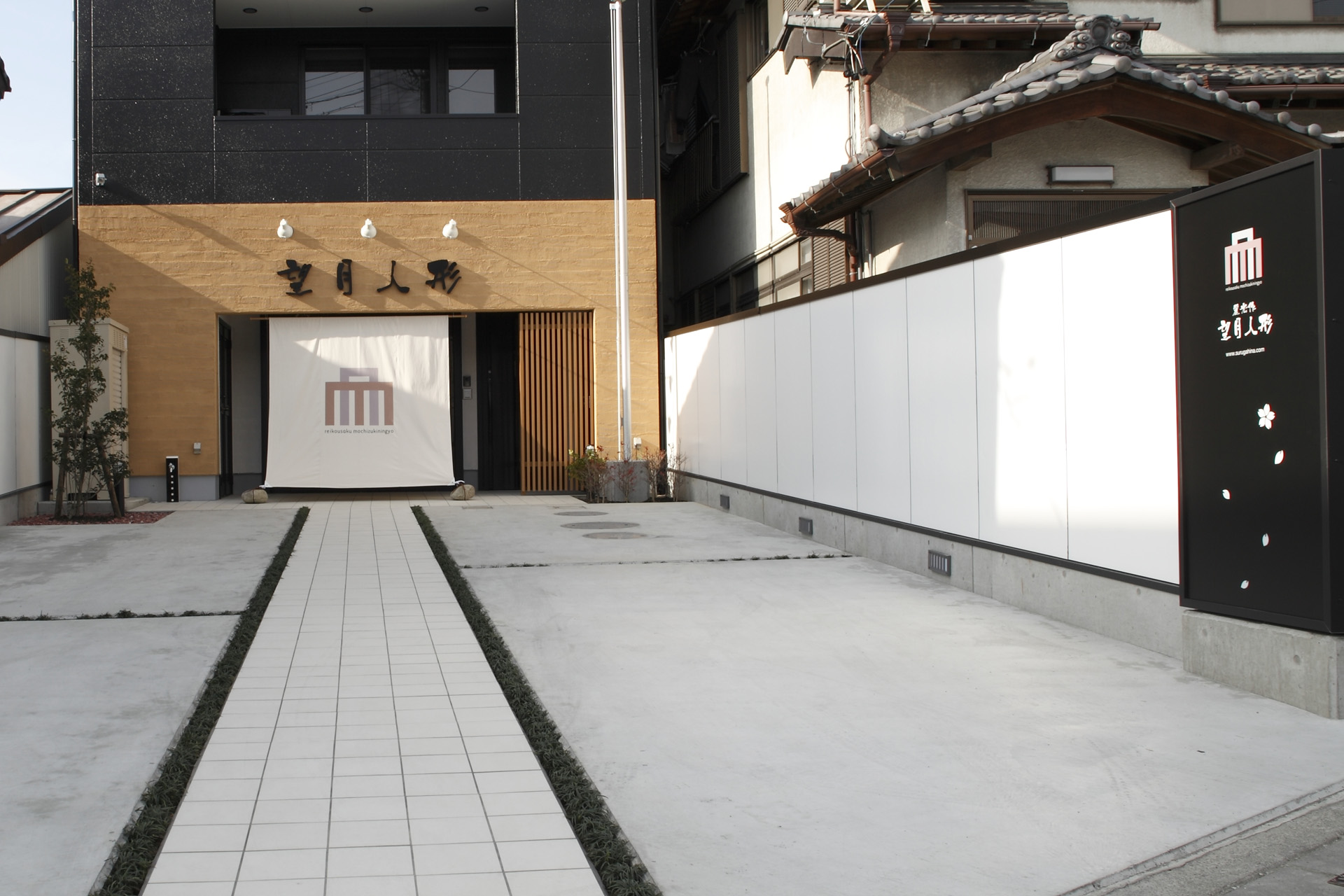 美しい漆喰と黒を基調とした和モダンな外観。店舗入口に続く白いタイルのアプローチの先には当店のロゴマークが入ったのれんがお客様をお出迎えいたします。